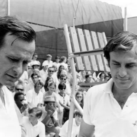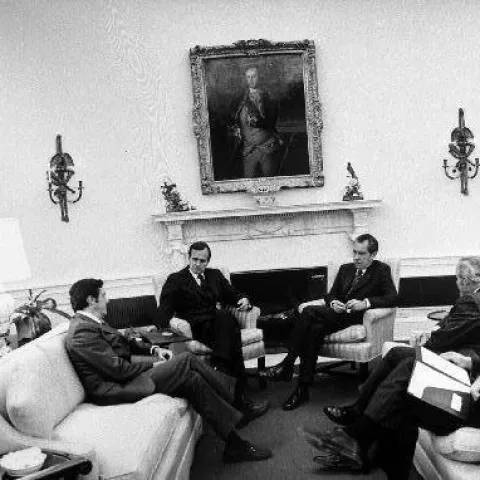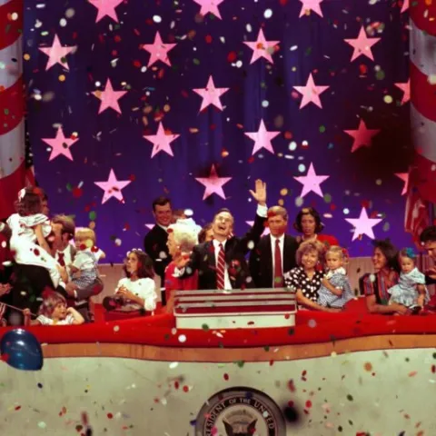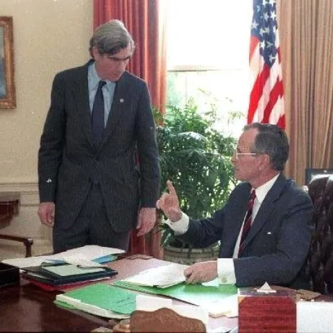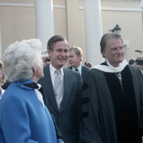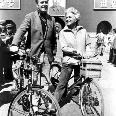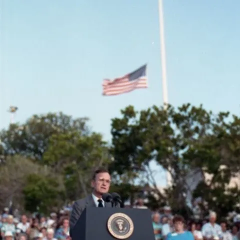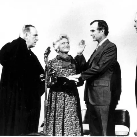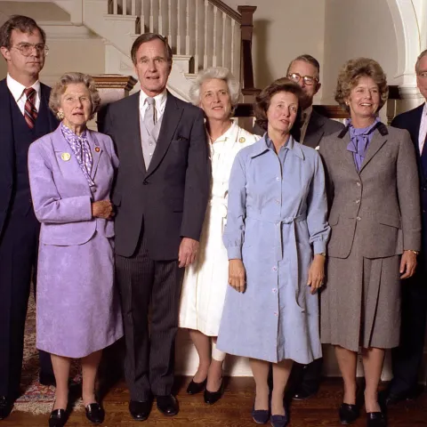 Below, you will find a small sampling of photographs from the library's collection. Presently, the Bush Library houses more than 2,000,000 still photos, 10,000 video tapes, and 1,000 audio tapes that focus on George Bush's career as Vice President (1981-1989) and President (1989-1993). A limited number of photos documenting Mr. Bush's public service and family life prior to 1981 are also available. The Audiovisual Archives also contains photos of Barbara Bush during Mr. Bush's years as Vice President and President.