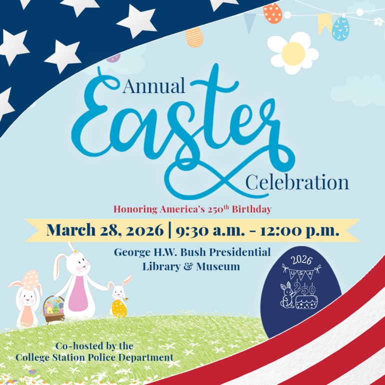 Free parking for the event will be available in Fan Field, the gravel lot off of Research Parkway. For the safety of the event attendees, Barbara Bush Drive will close at 8:30 a.m. All attendees should enter via Research Parkway. For more information about the Easter Celebration, visit Bush41Library.gov or call (979) 691-4014.