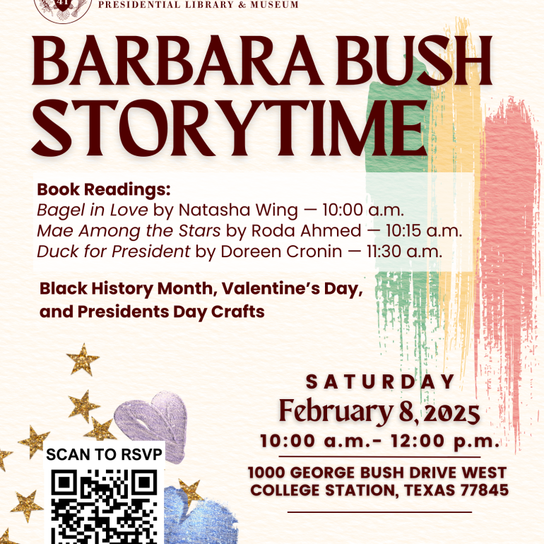 Join us for an exciting Barbara's Saturday Storytime at the George H.W. Bush Presidential Library and Museum on Saturday, February 8, from 10 a.m. to noon! This month, we are celebrating Valentine’s Day and Presidents Day!