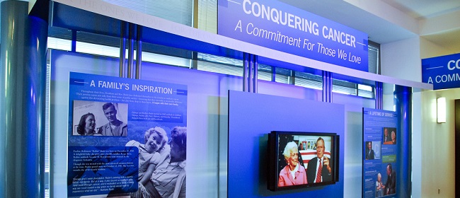 In 1998, President and Mrs. Bush helped create C-Change, then known as the National Dialogue on Cancer. For well over a decade they co-chaired this unique nonprofit organization, dedicated to eliminating cancer as a major public health burden at the earliest possible time. The "Conquering Cancer: A Commitment For the Ones We Love,” was a six-panel exhibit that highlighted the lifelong commitment of President and Mrs. Bush and the collaborative strength of the many cancer organizations that make up C-Change.