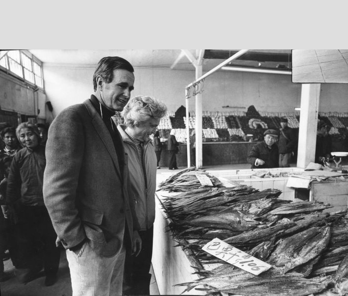 • George and Barbara Bush inspect fish for sale at a local market while in China as the US Liaison.
