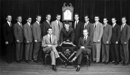 George Bush (left of clock) with the Skull and Bones group at Yale University, New Haven, CT. (Seated, L to R) David Charles Grimes, George Harold, Jr. (Standing, L to R) Lucius Horatis Biglow, Jr., William Donnelly, Jr. (?), Richard Gluock (?), William Judkins Clark, George Cook, George Bush, Thomas Wilder Moseley, Richard E. Jenkins, Unknown, Unknown, John E. Caulkins, Unknown, Thomas William Ludlow Ashley. Circa 1947