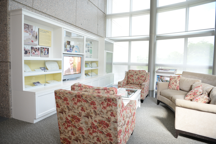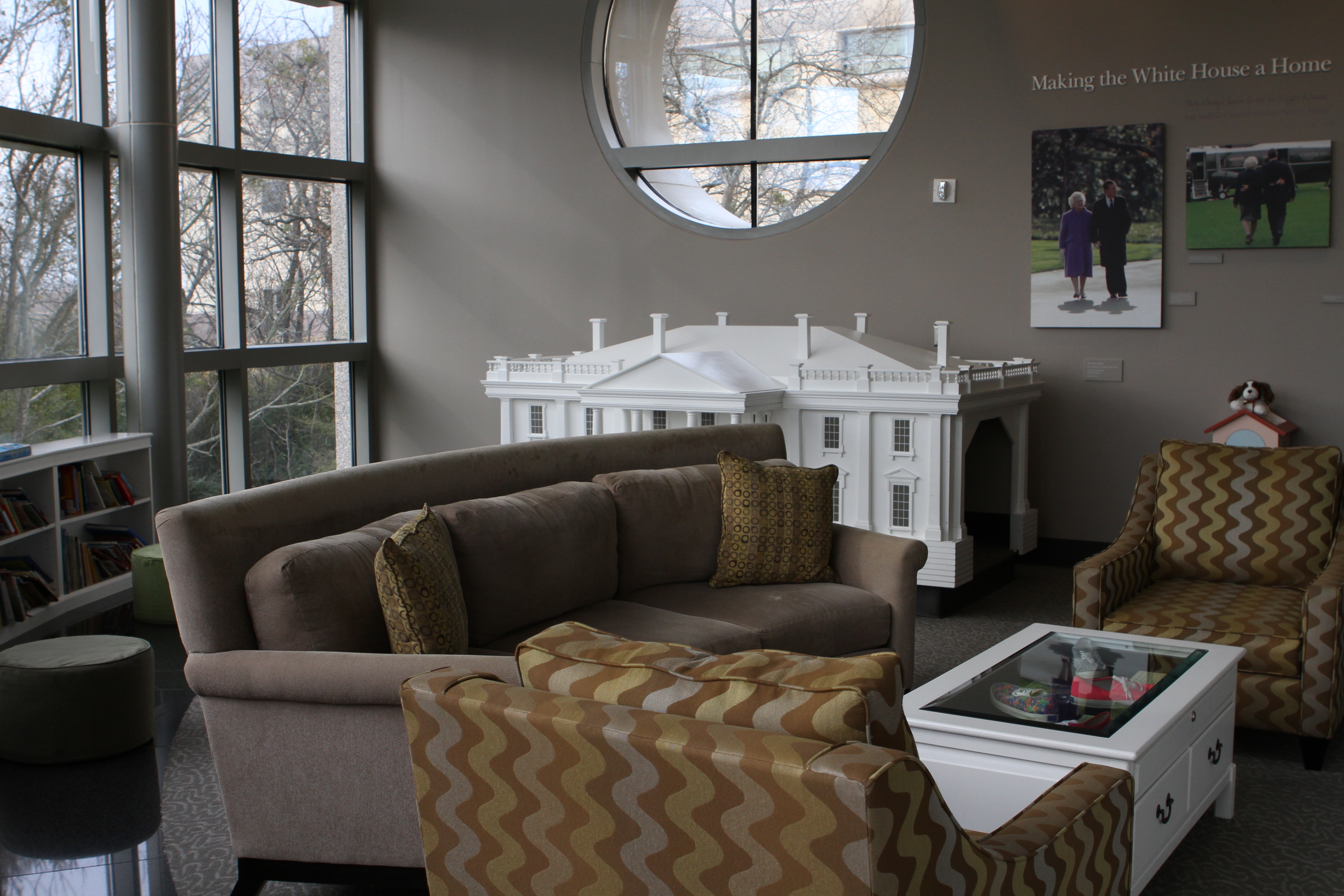 The Overlook is the perfect place to settle into a comfortable chair or couch while you read one of the many books available to your kids or grandkids. The kids can crawl inside the White House model and hear Mrs. Bush read one of four different stories. Don't miss the opportunity to survey the grounds behind the Library, which includes a beautiful pond and the Barbara Bush Rose Garden, or watch the entertaining video we affectionately call "Bushes Unplugged."