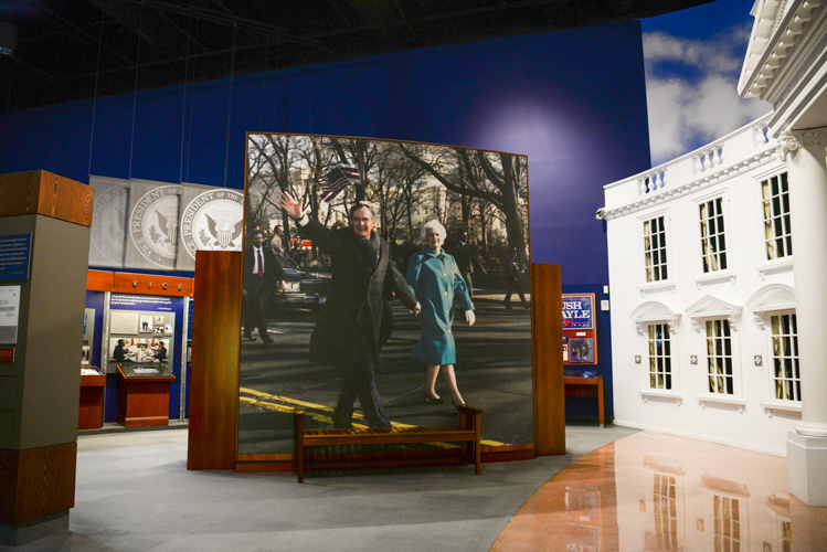 • Memorabilia in the Mr. President exhibit from the 1989 Inaugural Ball. On display is First Lady Barbara Bush's evening gown.