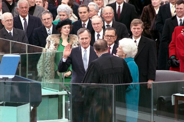 • George Herbert Walker Bush takes the oath of office as the 41st President of the United States administered by Supreme Court Chief Justice Rehnquist at the US Capital, Washington, DC. 20 Jan 89