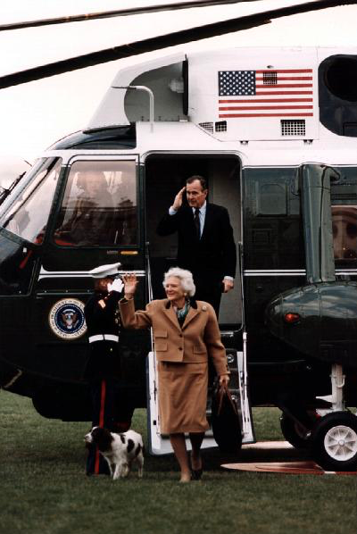 • President Bush, Mrs. Bush, and Millie leave Marine One.  12 Mar 89