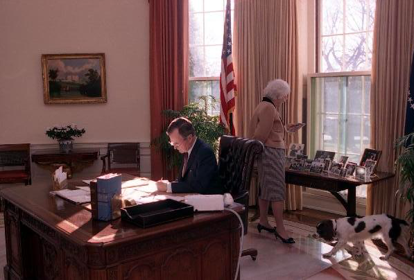 • Mrs. Bush examines family photographs and Millie paces the floor as President Bush works at his desk in the Oval Office.  27 Jan 89