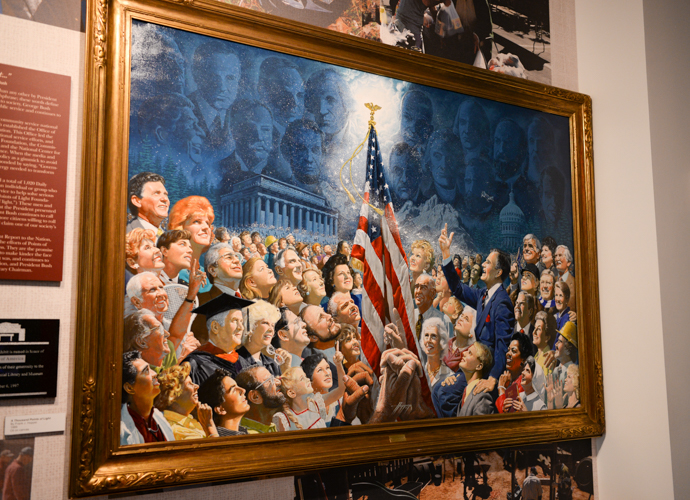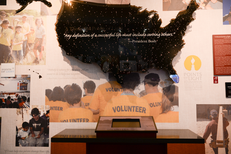 The Points of Light Foundation is an organization devoted to encouraging volunteerism within our communities. This part of the exhibit features a fiber-optic map of the United States, whose lights represent the points of light across America, and an interactive database that allows you to search and view profiles of the 4000 named Points of Light, including those chosen during the Bush Administration.