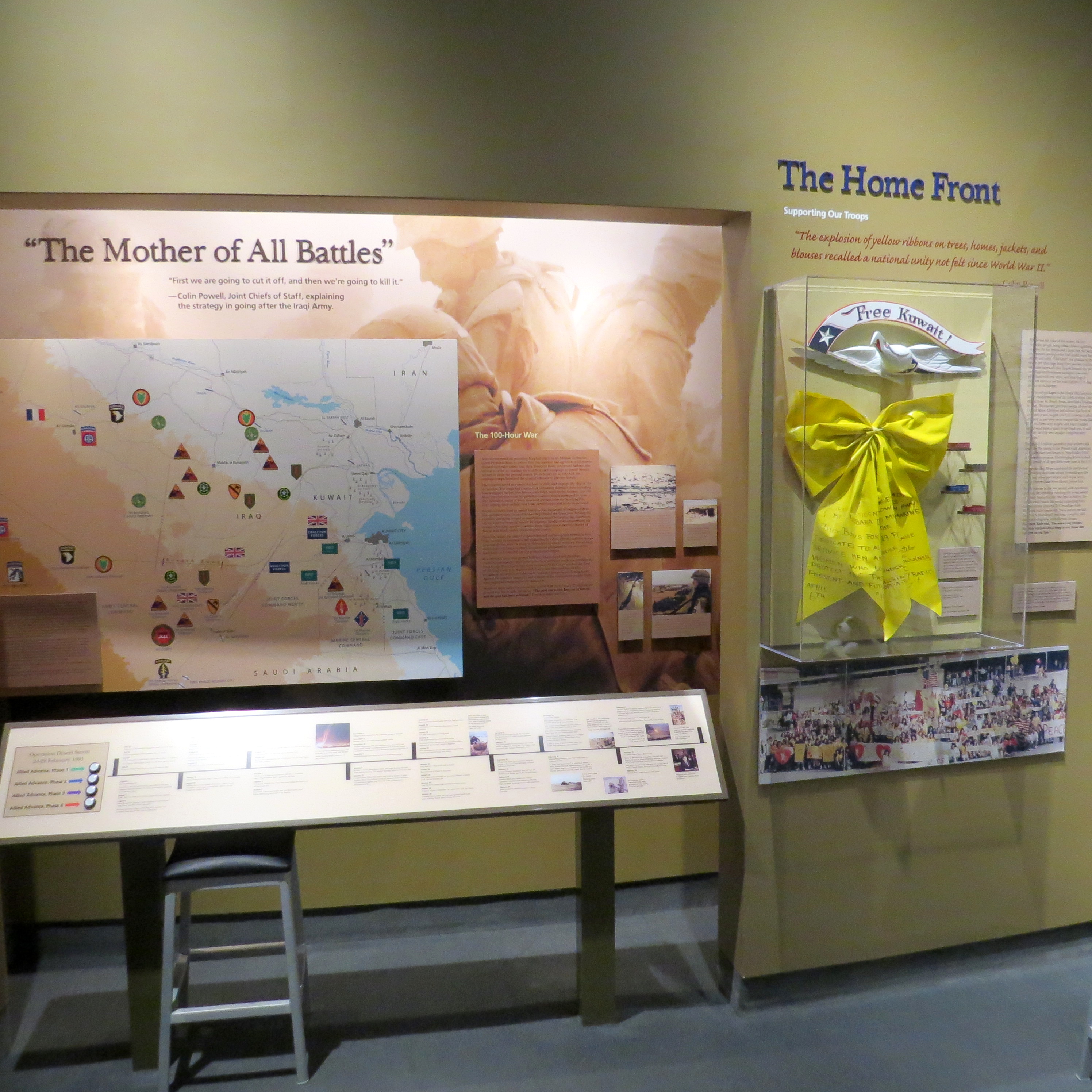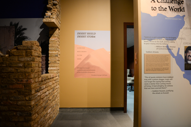 From the Situation Room, emerge into the Gulf War exhibit. Interactive displays and fiber optic maps detail the events surrounding the battles in the Gulf. Learn how President Bush built a coalition of nations to turn back the aggression of Saddam Hussein and Iraq and to liberate Kuwait.