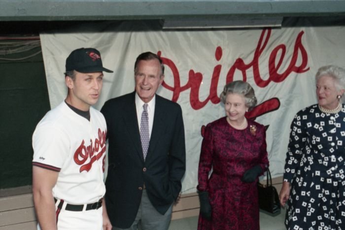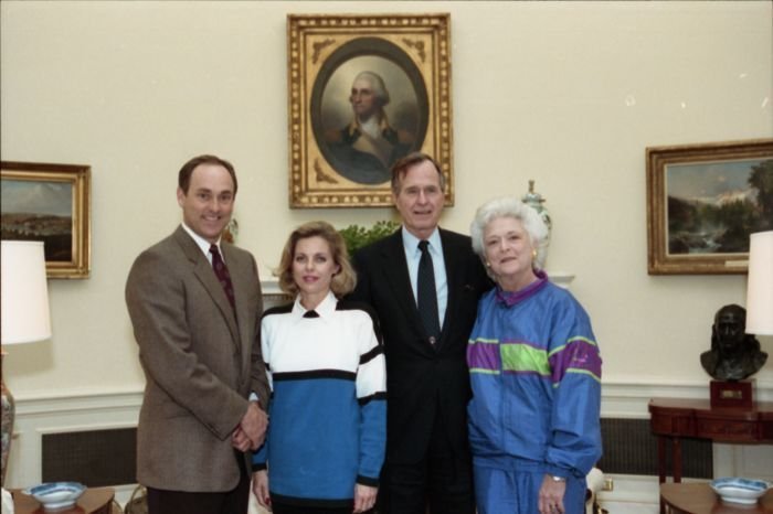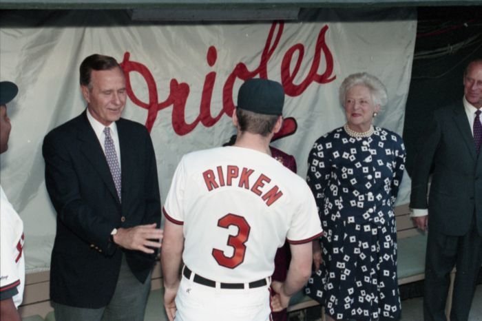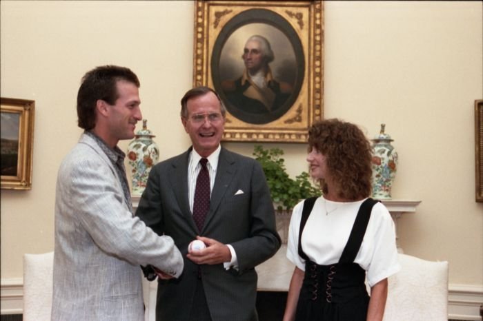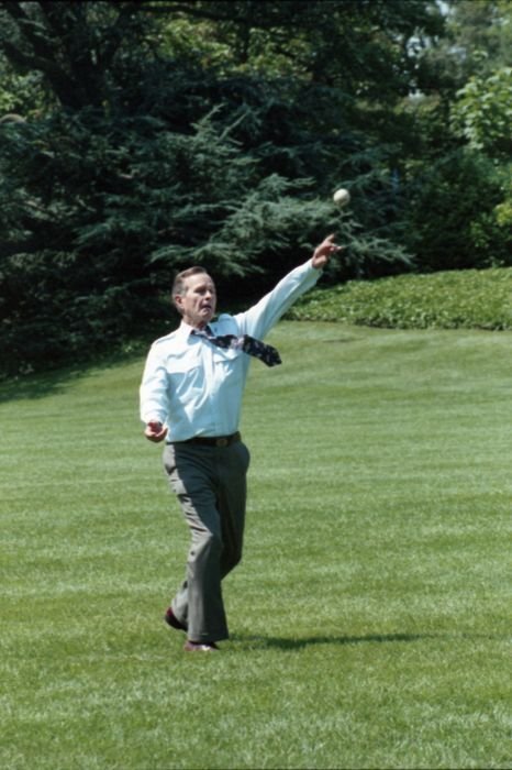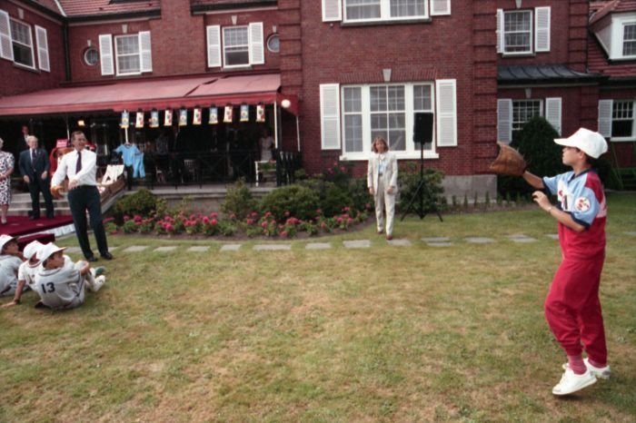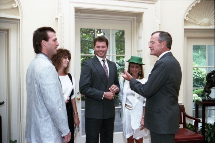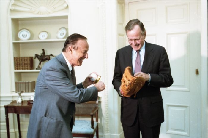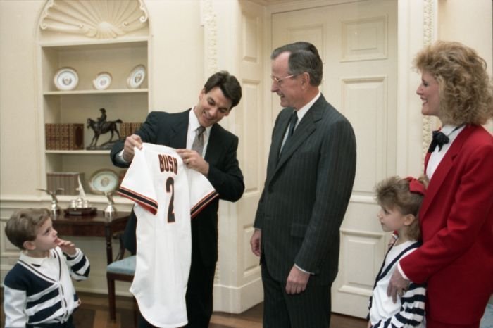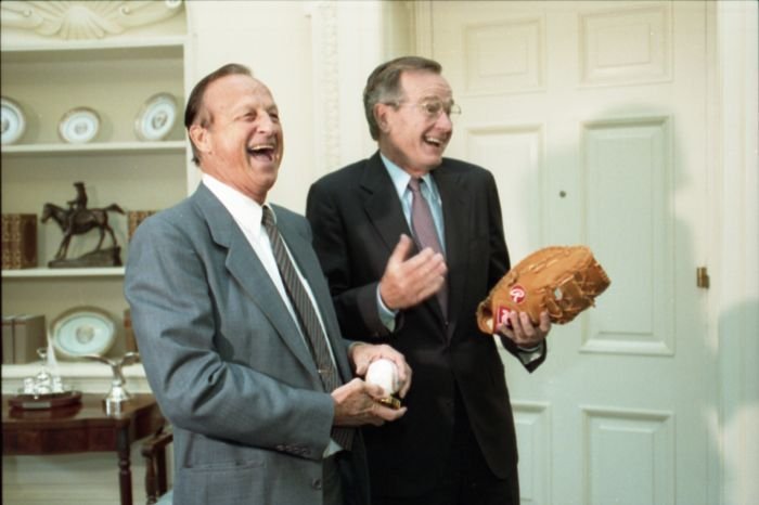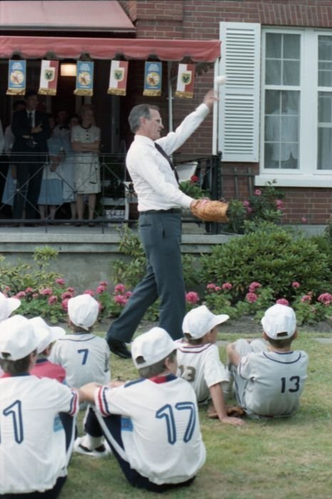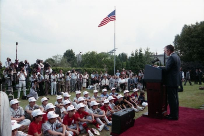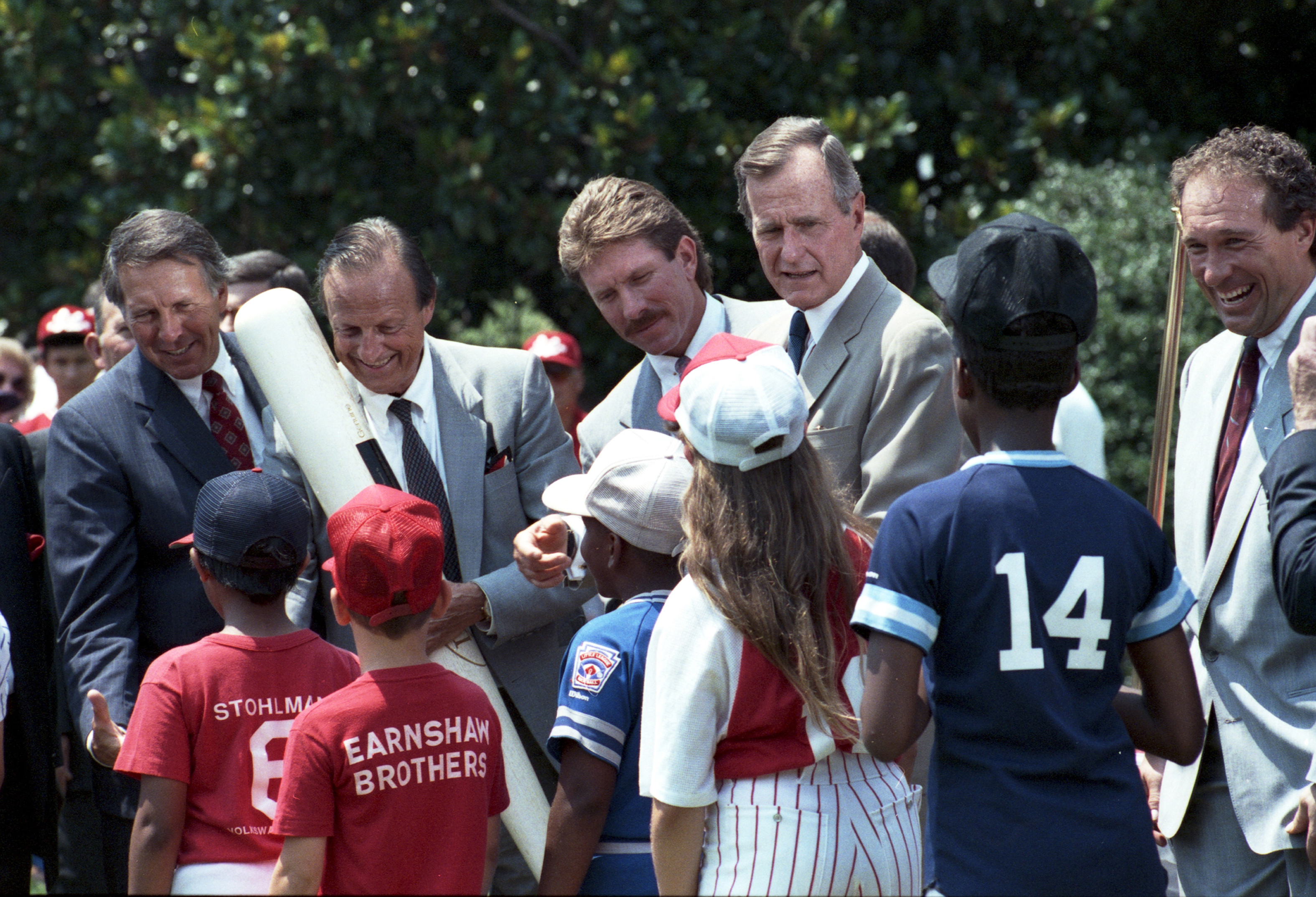 Original caption: On the South Lawn of the White House, President Bush, along with baseball greats Brooks Robinson, Stan Musial, Mike Schmidt and Gary Carter, celebrate with players the 50th anniversary of Little League Baseball.View in the National Archives Catalog