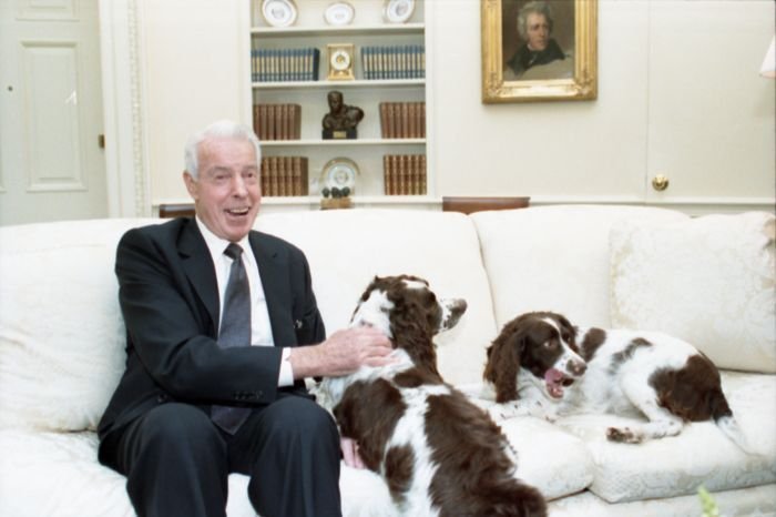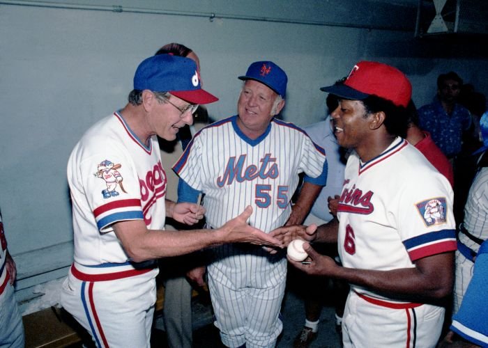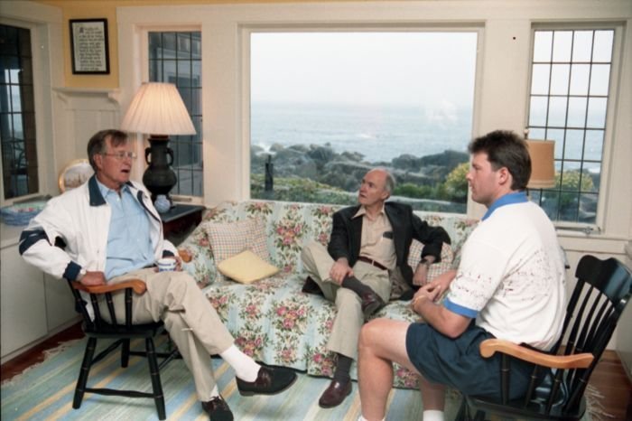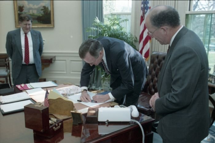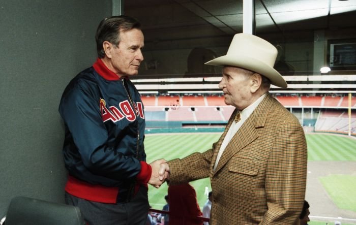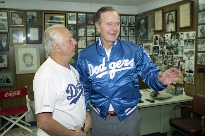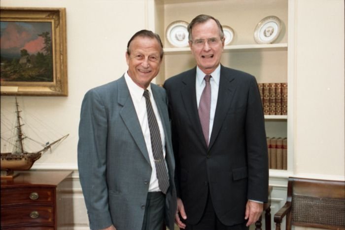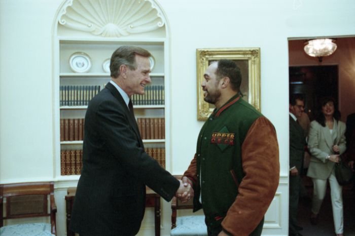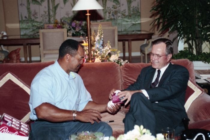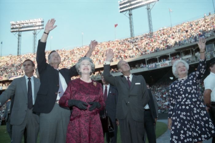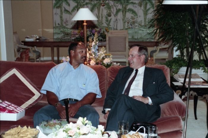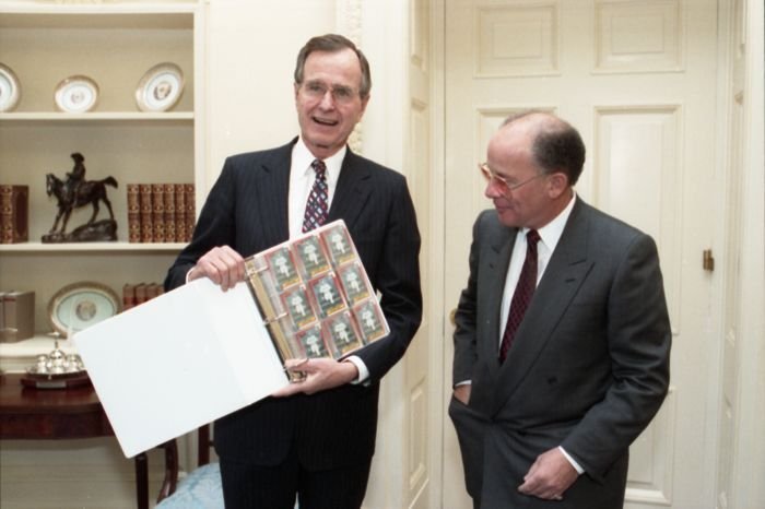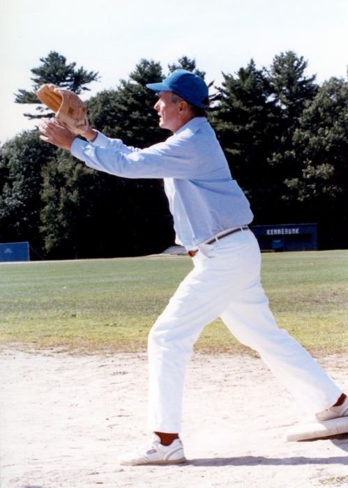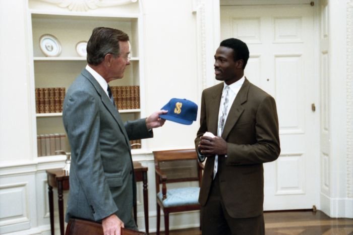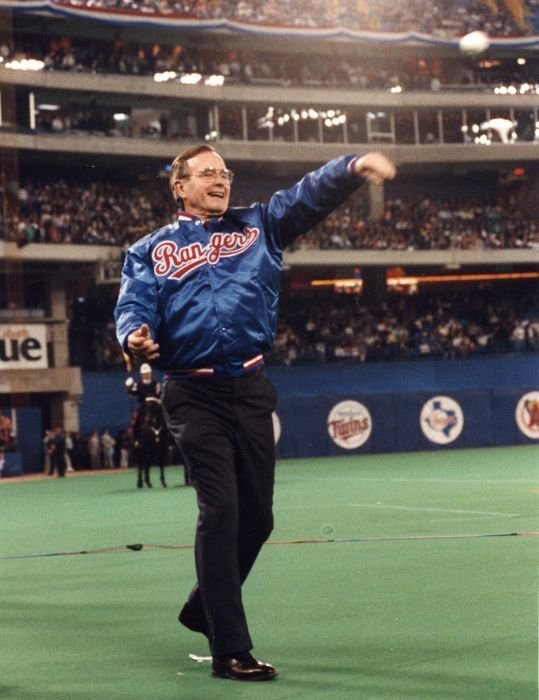 Original caption: On the South Lawn of the White House, President Bush, along with baseball greats Brooks Robinson, Stan Musial, Mike Schmidt and Gary Carter, celebrate with players the 50th anniversary of Little League Baseball.View in the National Archives Catalog