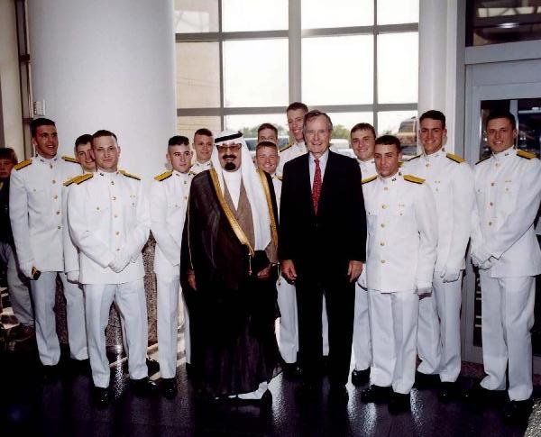 CA200214.01-9633 - Crown Prince Abdullah of Saudi Arabia with Former President Bush and the Texas A&M University Ross Volunteers Honor Guard at the George Bush Presidential Library. Fa26 Apr 02View in the National Archives Catalog