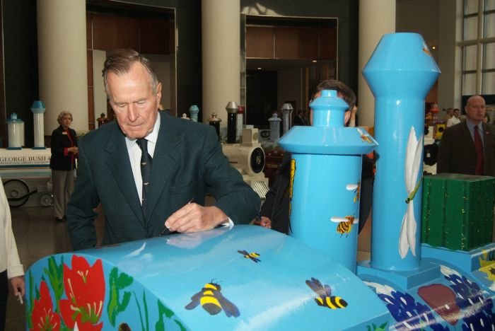 CA200612D0065 - President Bush signs one of the miniature trains displayed in the community during the exhibit - TRAINS: Tracks of the Iron Horse, 13 Oct 06.View in the National Archives Catalog