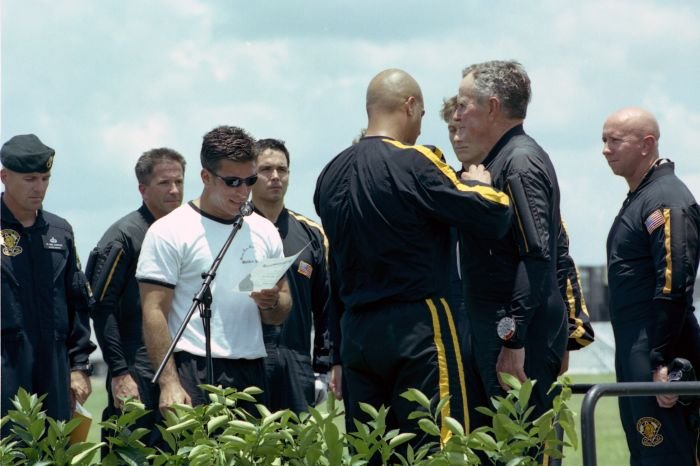 CA200408.16-15A - Former President Bush receives his jump wings from a member of the US Army Golden Knights Parachute Team following his 80th birthday parachute jumps at the George Bush Presidential Library, College Station, TX. 13 Jun 04View in the National Archives Catalog