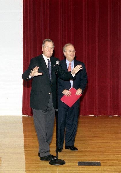 CA200231.03-01A - Former President Bush and The Honorable Karl Rove, White House Senior Advisor to President George W. Bush, share a laugh as Mr. Rove is introduced to present the William Waldo Cameron Lecture at the Presidential Conference Center, College Station, TX. 13 Dec 02View in the National Archives Catalog