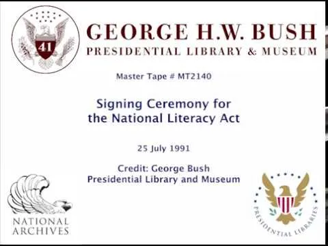 MT2140 Signing Ceremony for the National Literacy Act, 25 July 1991. This is video footage of President George Bush signing the National Literacy Act of 1991 in the Roose...Show moreMT2140 Signing Ceremony for the National Literacy Act, 25 July 1991. This is video footage of President George Bush signing the National Literacy Act of 1991 in the Roosevelt Room, at the White House, on 25 July 1991. This footage is official public record produced by the White House Television (WHTV) crew. Show less -