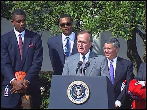 MT2231 - Ceremony for the Chicago Bulls, NBA Champions – 10 October 1991. This is video footage of President gives remarks concerning the Chicago Bull's championship win ...Show moreMT2231 - Ceremony for the Chicago Bulls, NBA Champions – 10 October 1991. This is video footage of President gives remarks concerning the Chicago Bull's championship win and thanks the players and coaches for coming to the White House.. This footage is official public record produced by the White House Television (WHTV) crew. Show less -