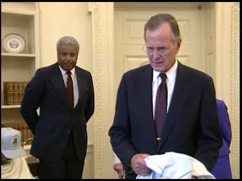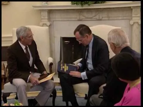 MT1891 President Bush, Leo Nadeau, and Robert Stinnett in the Oval Office - 23 May 1991. This is video footage of President George Bush visiting with fellow veterans of t...Show moreMT1891 President Bush, Leo Nadeau, and Robert Stinnett in the Oval Office - 23 May 1991. This is video footage of President George Bush visiting with fellow veterans of the USS San Jacinto in the Oval Office on 23 May 1991. This footage is official public record produced by the White House Television (WHTV) crew. Show less -