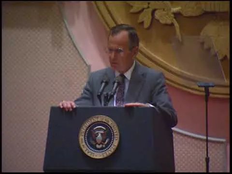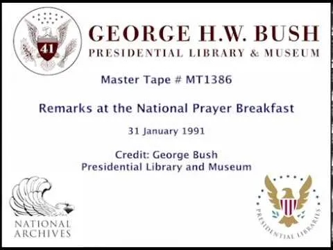 MT1386 President and Mrs. Bush attend the 1991 National Prayer Breakfast, 31 January 1991. This is video footage of President George Bush delivering remarks at the 1991 N...Show moreMT1386 President and Mrs. Bush attend the 1991 National Prayer Breakfast, 31 January 1991. This is video footage of President George Bush delivering remarks at the 1991 National Prayer Breakfast. This footage is official public record produced by the White House Television (WHTV) crew. Show less -