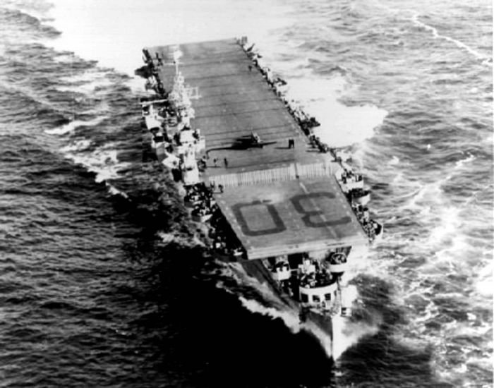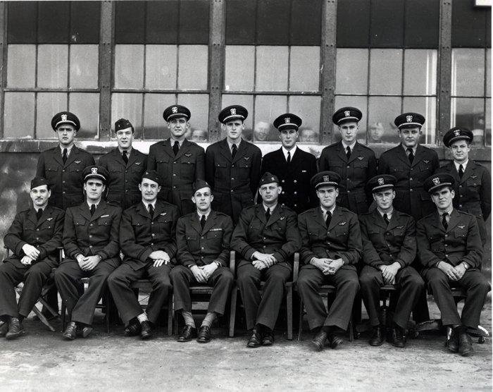 Standing L to R: Ensign James J. Wykes, aviator; Ensign Stanley P. Butchart, aviator; Ensign Jack O. Guy, aviator; Ensign Lou J. Grab, aviator; Lt (jg) William G. White, ordnance officer; Ensign George H. W. Bush, aviator; Ensign Howard G. Boren, aviator; and Ensign Douglas H. West, aviator. (Sitting L to R): Ensign Francis M. Waters, aviator; Lt Forrest H. Daniels, personnel officer; Lt Richard R. Houle, aviator; Lt Ross G. Allen, intelligence officer; Lt Commander Donald Melvin, Commanding Officer; Lt Legare R. Hole, Executive Officer/aviator; Lt (jg) Milan S. Nemsak, aviator; and Lt (jg) Richard B. Plaisted, aviator.View in the National Archives Catalog