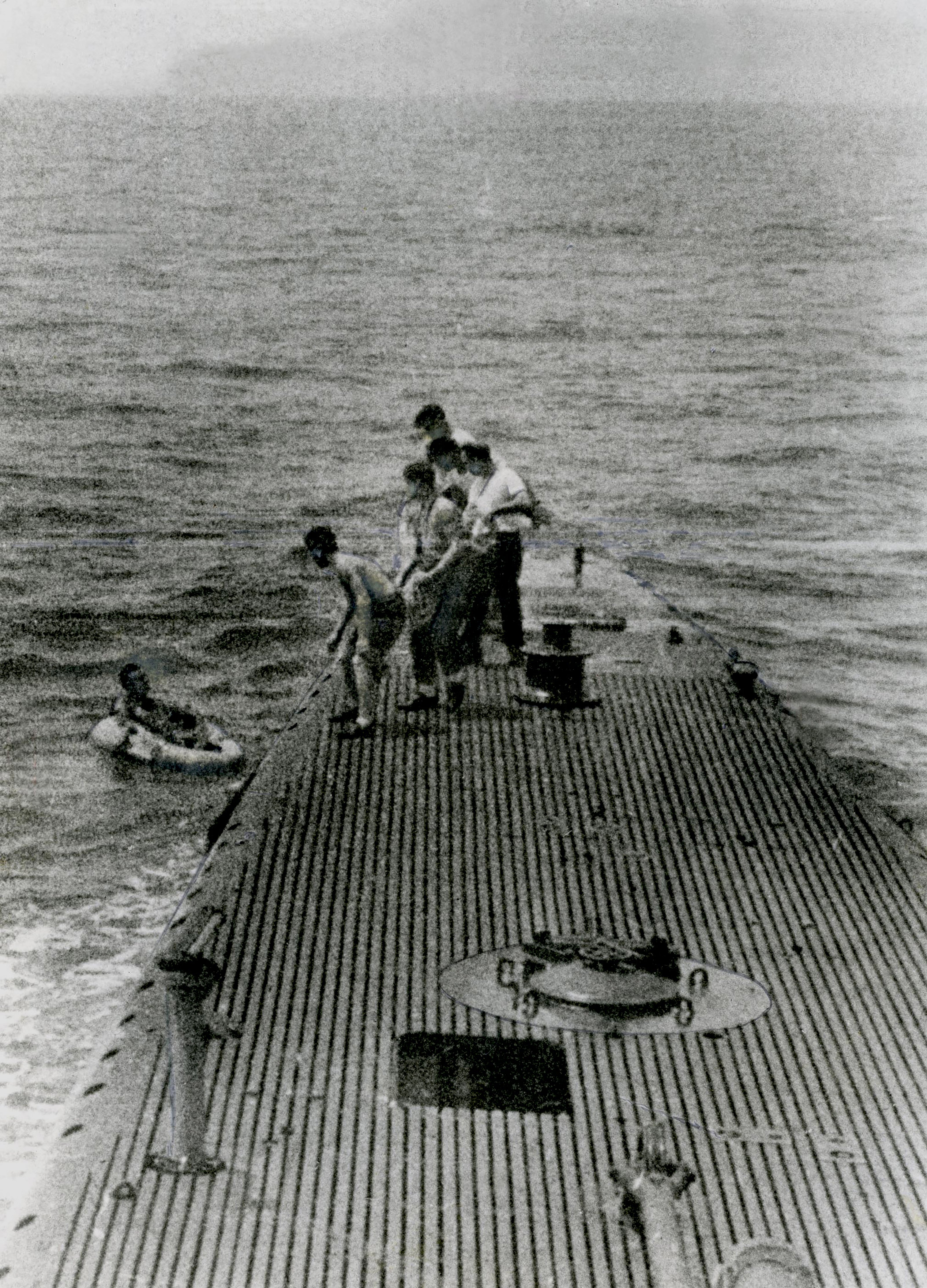 Aviators and crewmen rescued by the USS Finback during the first phase of Operation Stalemate II pose for a photo with officers of the USS Finback (kneeling L to R): Ensign Thomas Keene (USS Enterprise), Lt (jg) George Bush (USS San Jacinto), Ensign James W. Beckman (USS Franklin), AOM 3/c James T. Stovall (USS Franklin), ARM 3/c John R. Dougherty (USS Franklin); Officers of the USS Finback (standing L to R): Lt James Griswold, Lt (jg) William H. Parkman, Lt (jg) Jack Peat, Ensign William Edwards, LCDR Dean Spratlin, LCDR Robert Williams, Lt. J. L. Lawrence, Lt. Lawrie Heyworth, Lt Jerry Redmond, Lt (jg) Ollie Brostrom. Keene, Stoval and Doherty, were Avenger Crew members from USS Franklin, and were picked up off Iwo Jima. Bush and Beckman (a fighter pilot from the USS Enterprise) were rescued off Chichi Jima.View in the National Archives Catalog