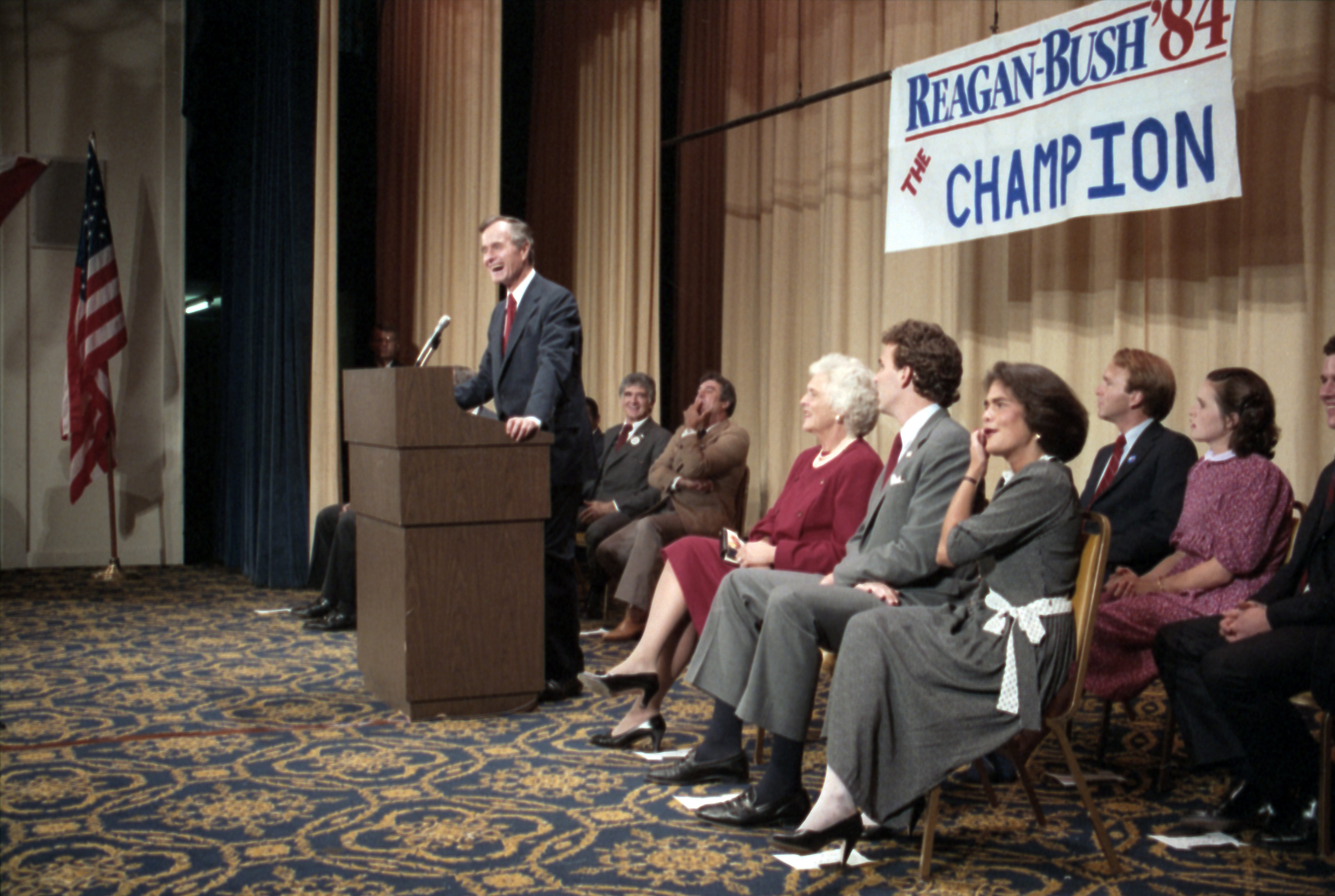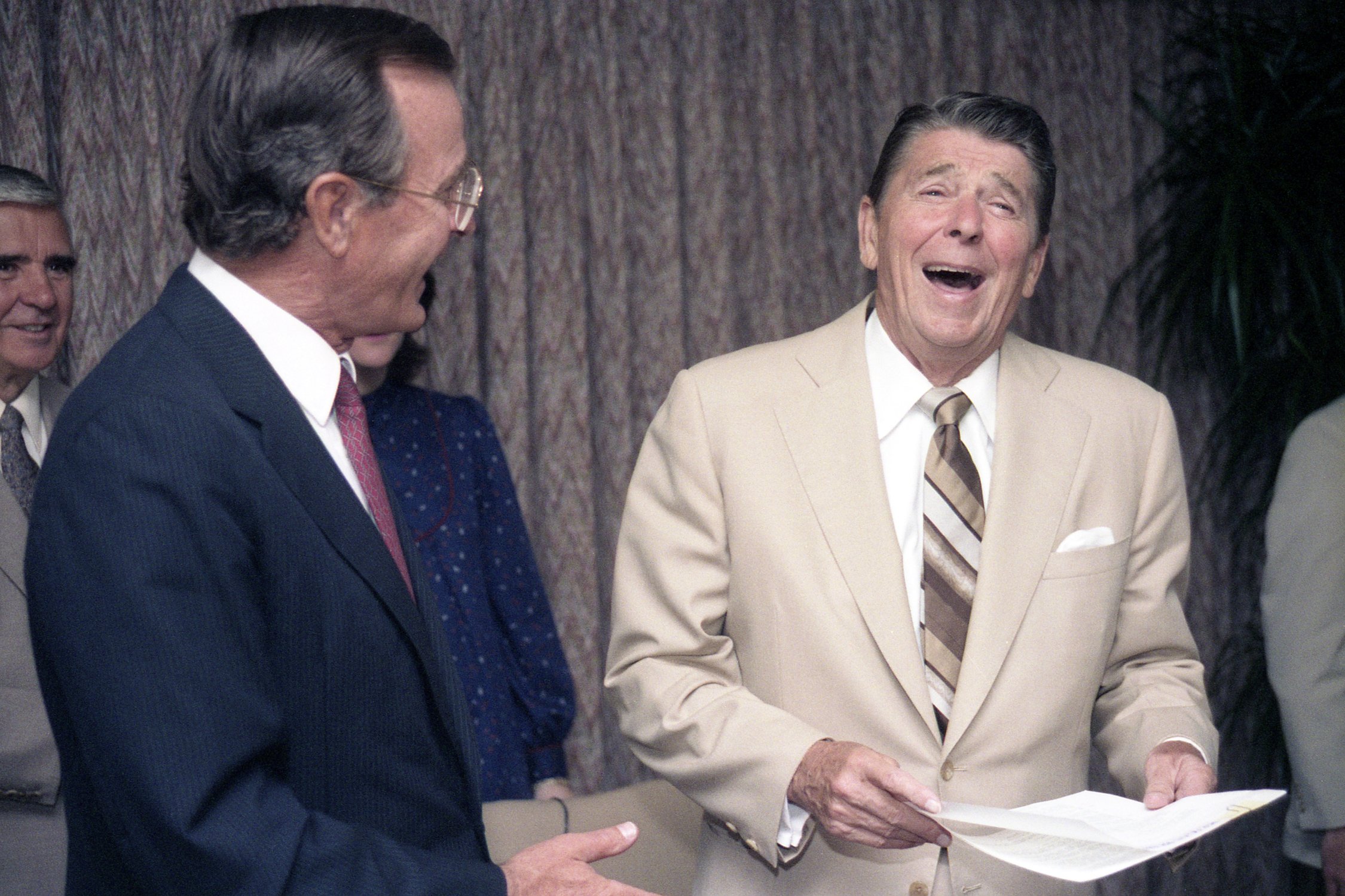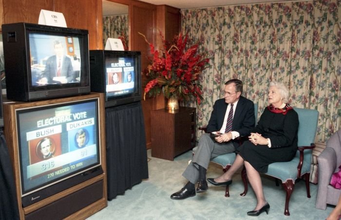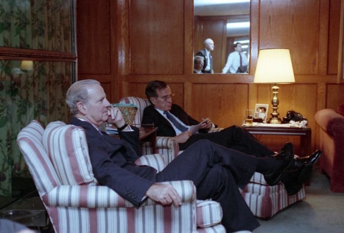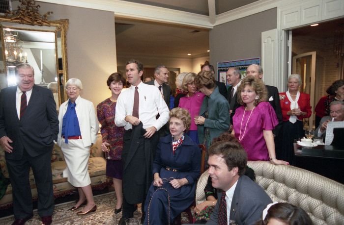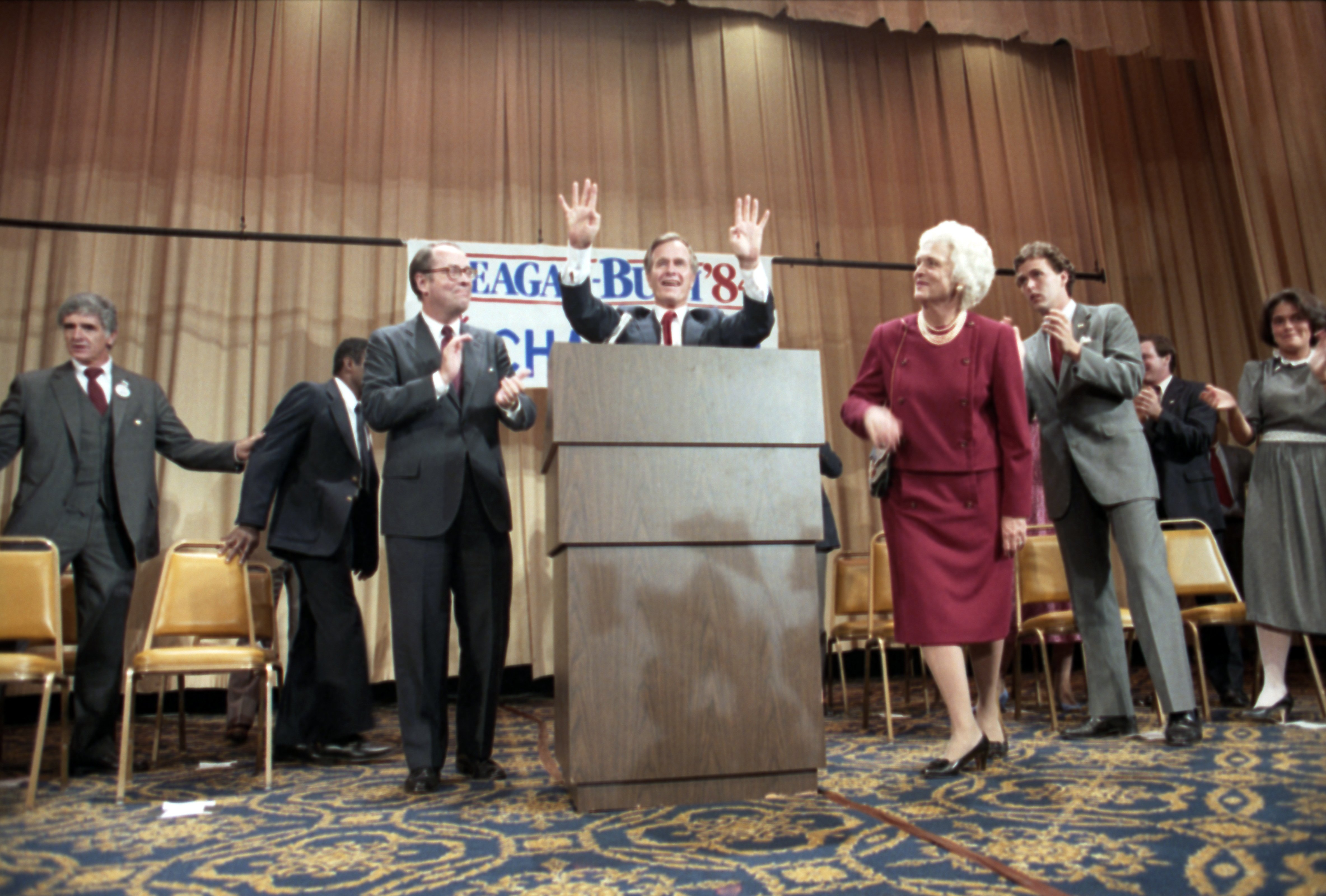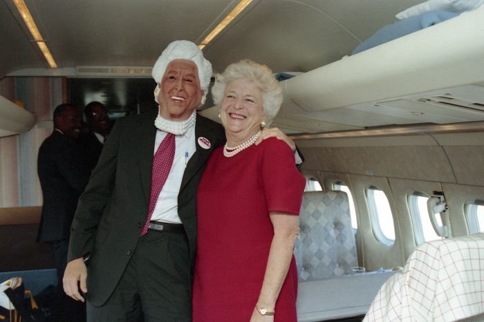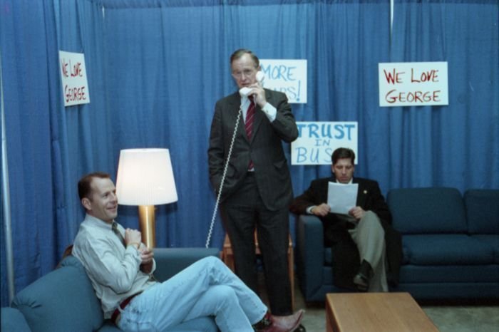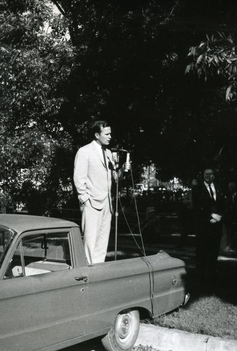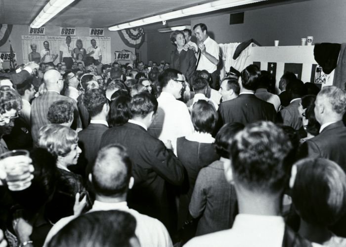 As George Bush talks on the phone, his wife, Barbara, looks over his shoulder at the George Bush for Senate Headquarters, Aleene Smith's office, in Houston, TX, 1964View in the National Archives Catalog