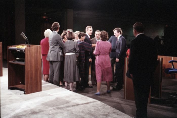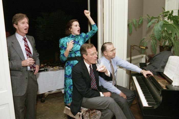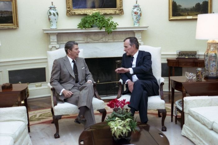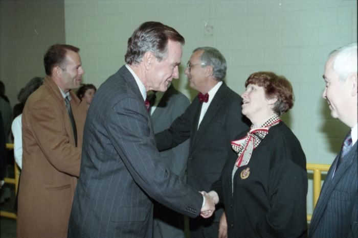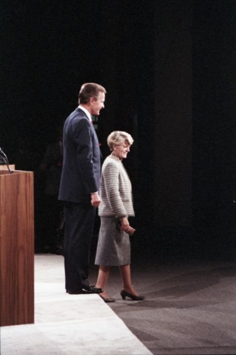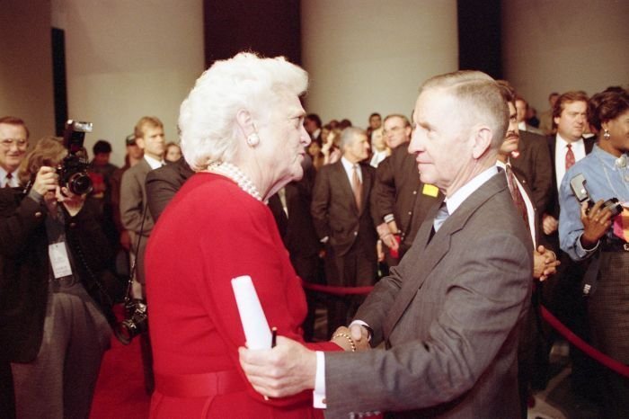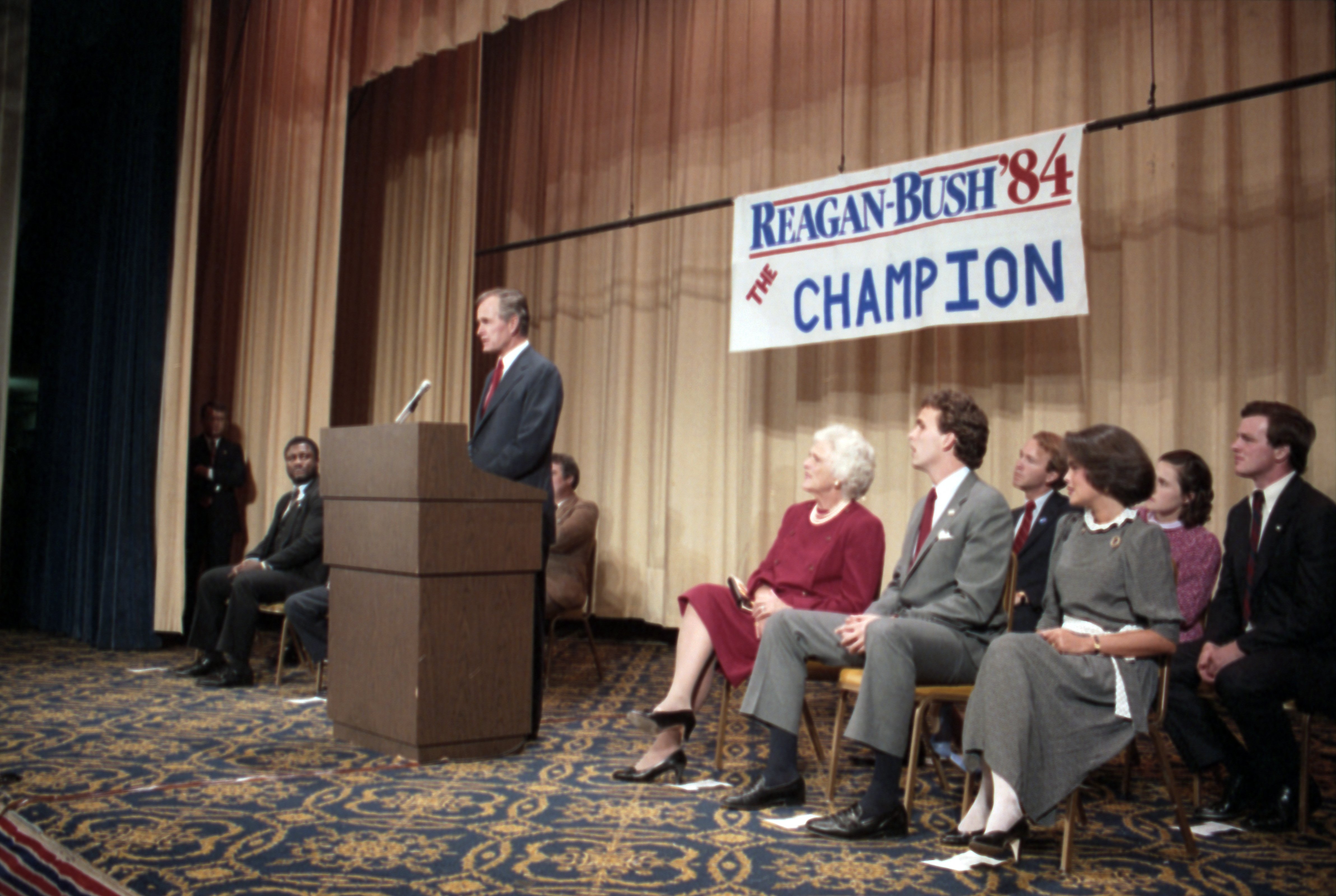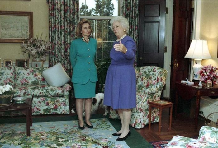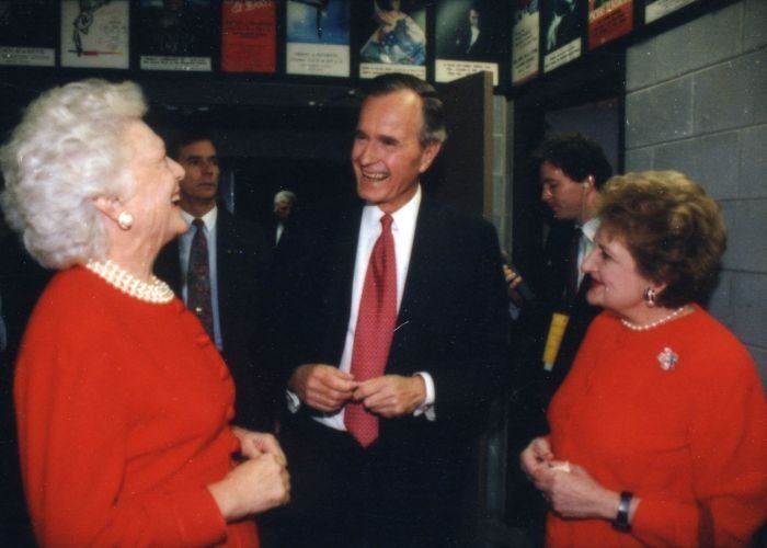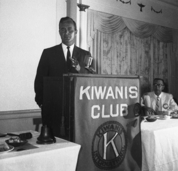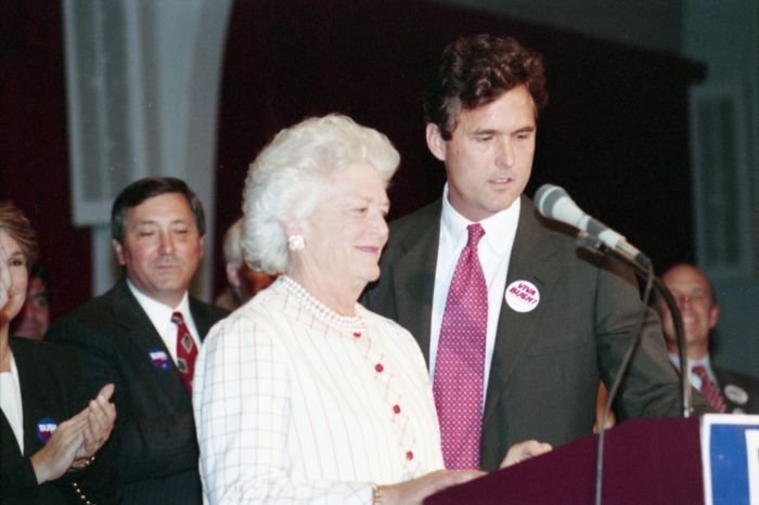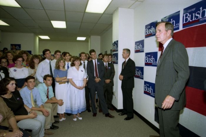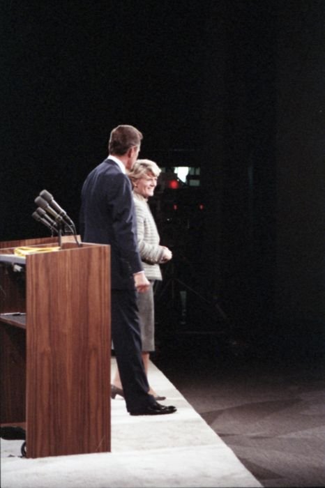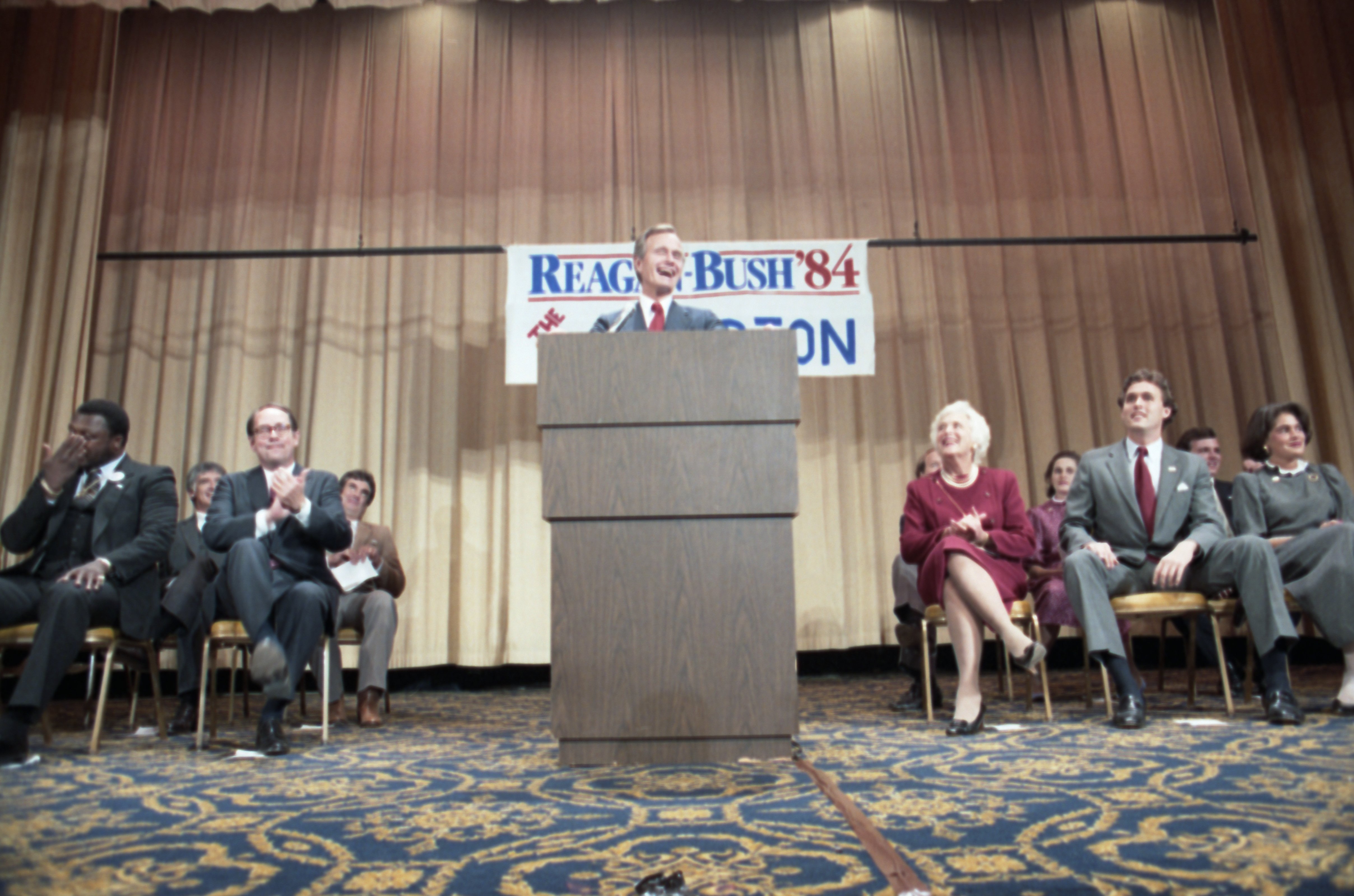 As George Bush talks on the phone, his wife, Barbara, looks over his shoulder at the George Bush for Senate Headquarters, Aleene Smith's office, in Houston, TX, 1964View in the National Archives Catalog