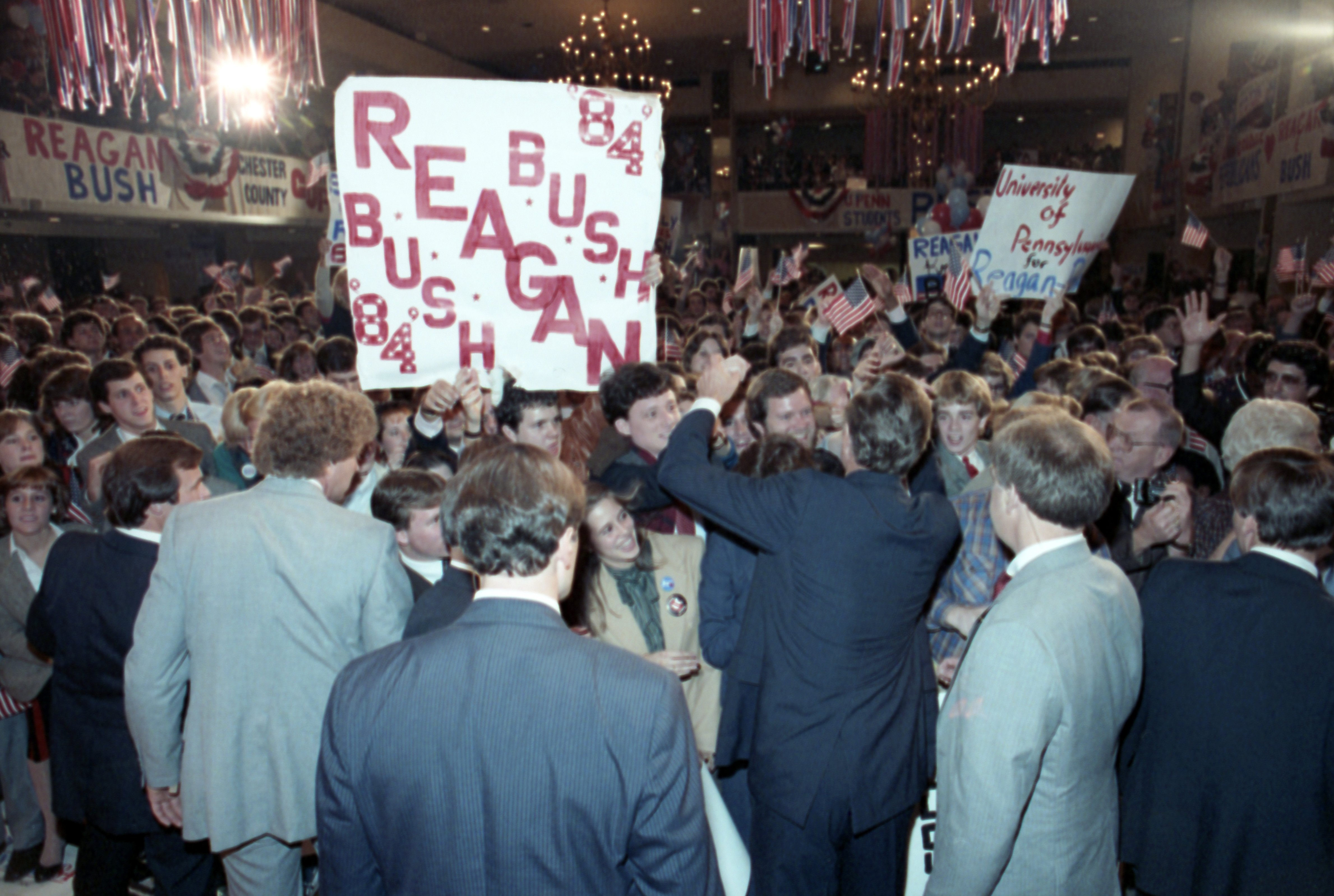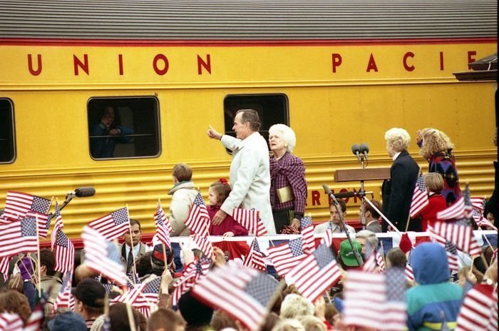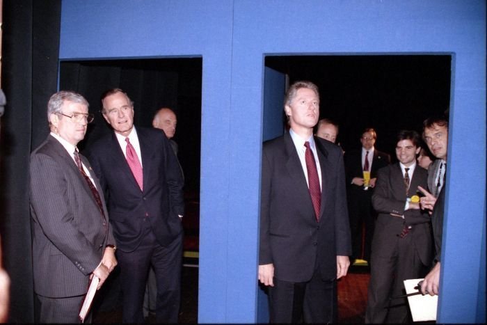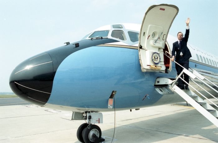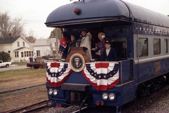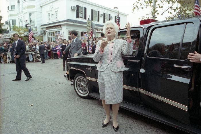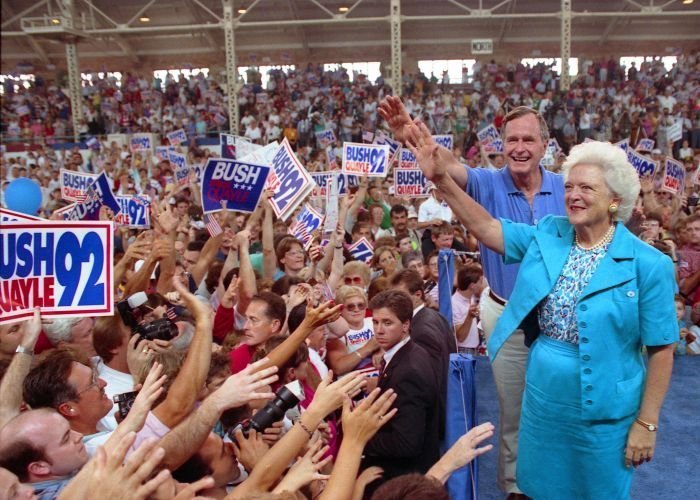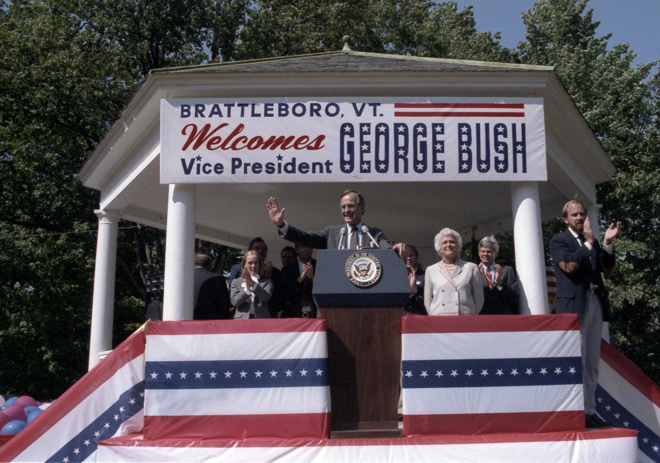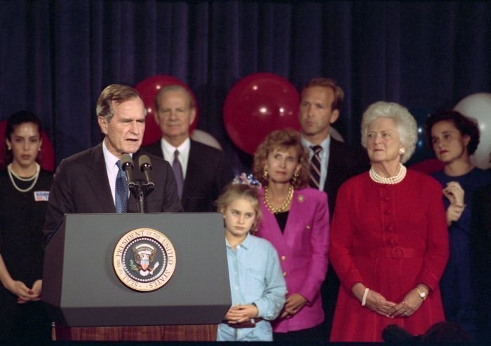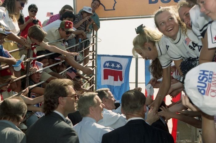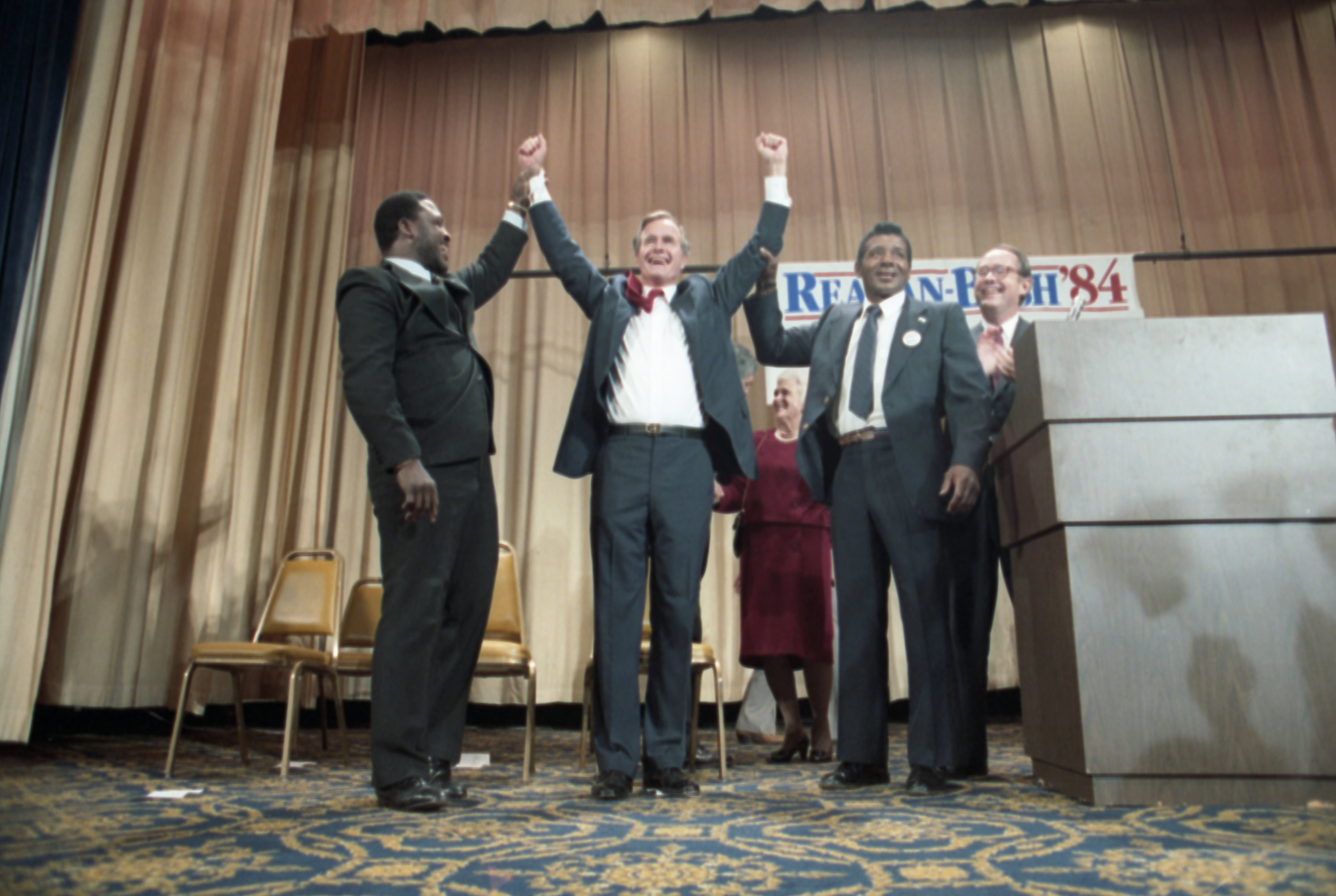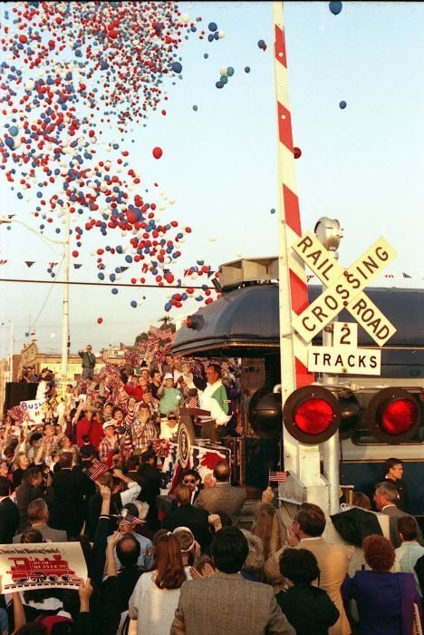 As George Bush talks on the phone, his wife, Barbara, looks over his shoulder at the George Bush for Senate Headquarters, Aleene Smith's office, in Houston, TX, 1964View in the National Archives Catalog