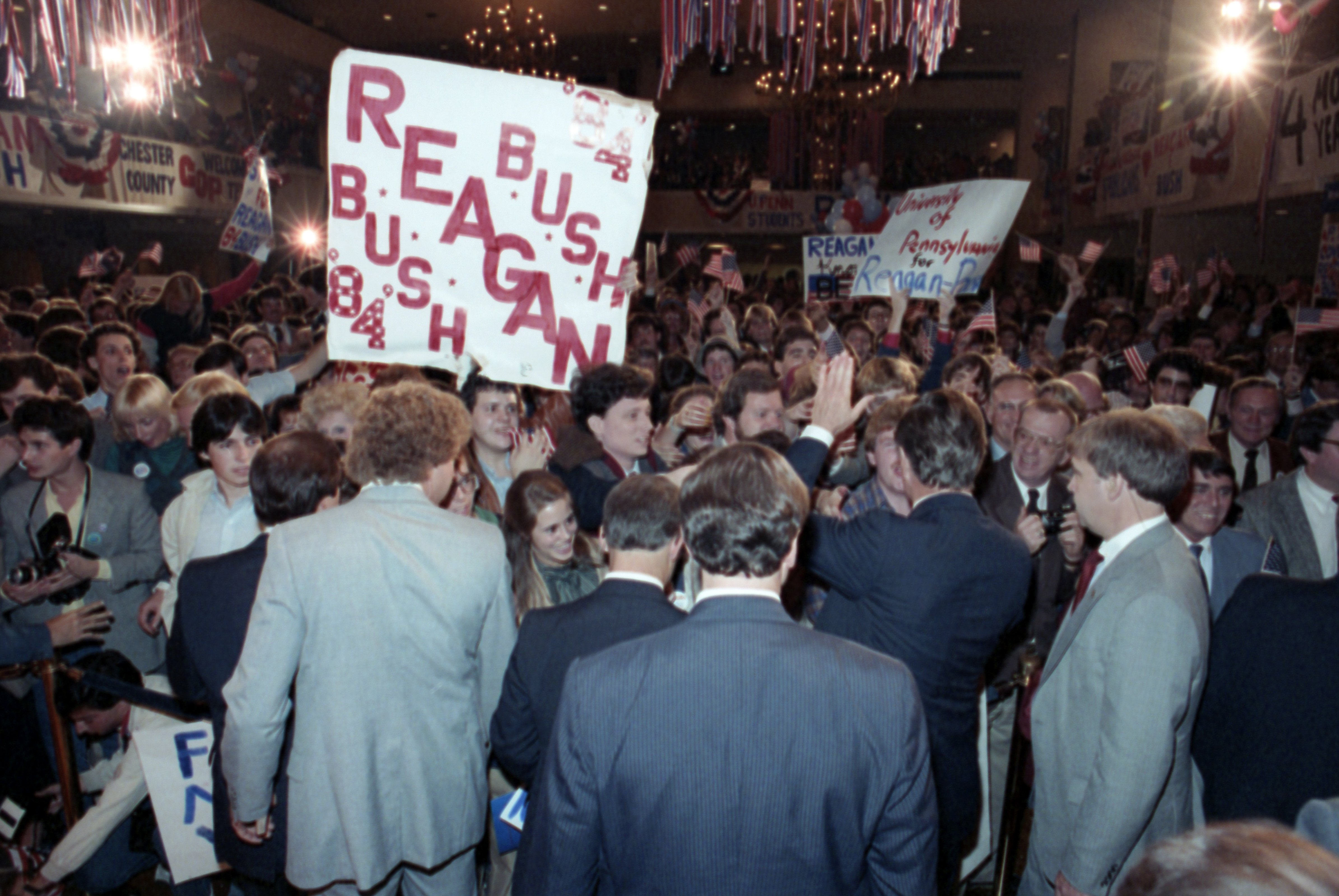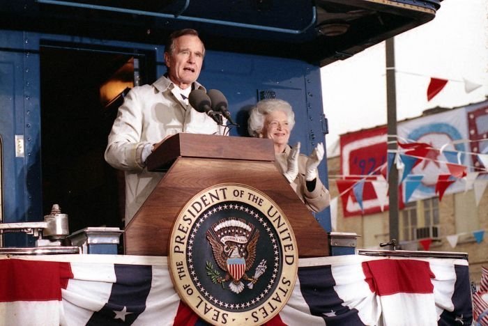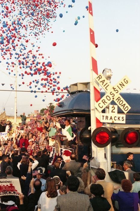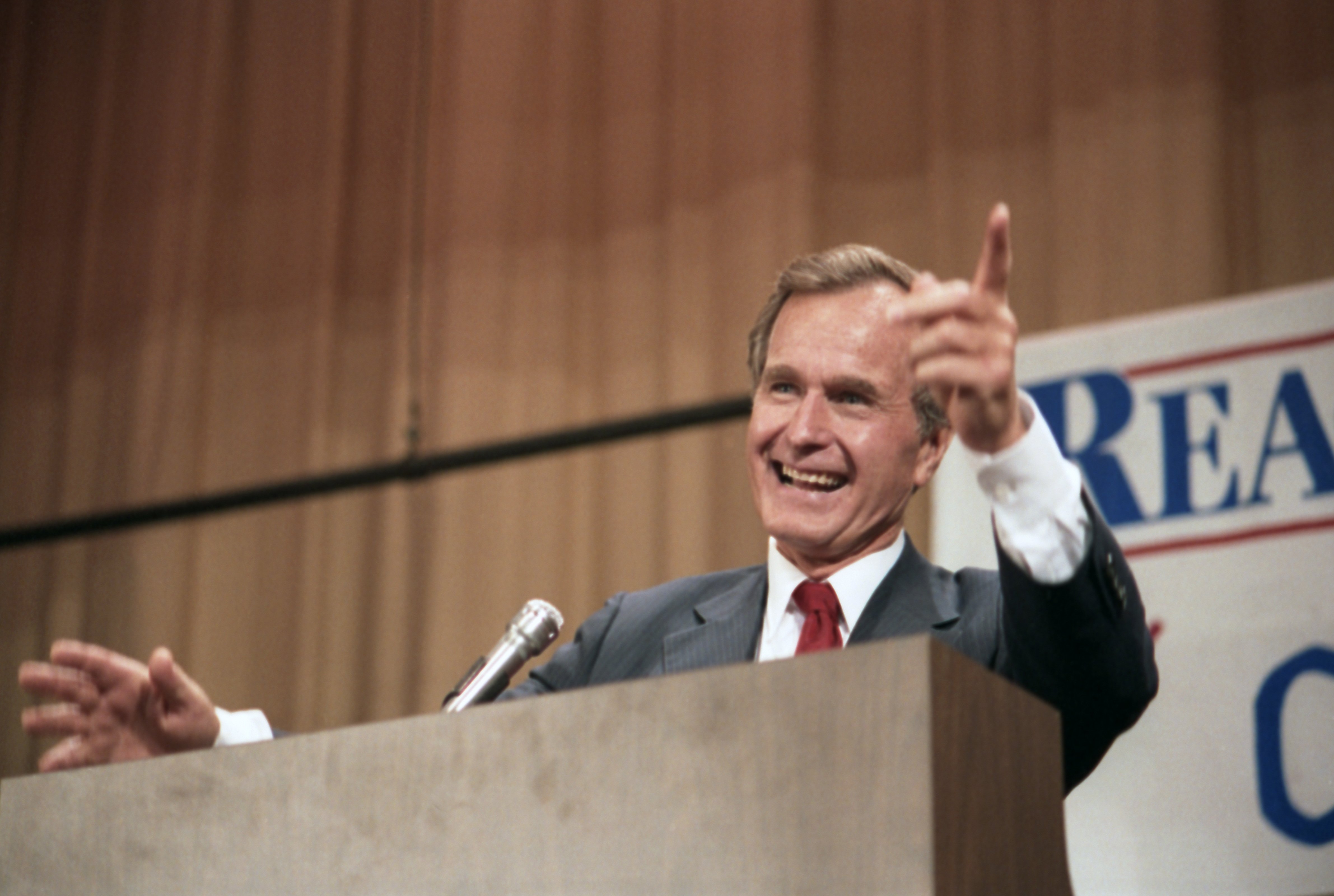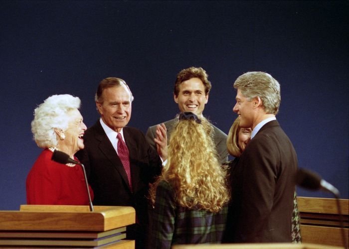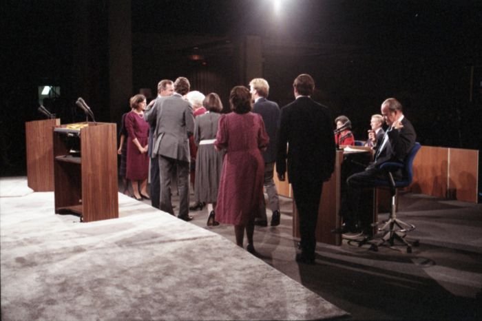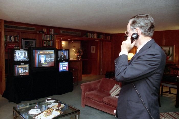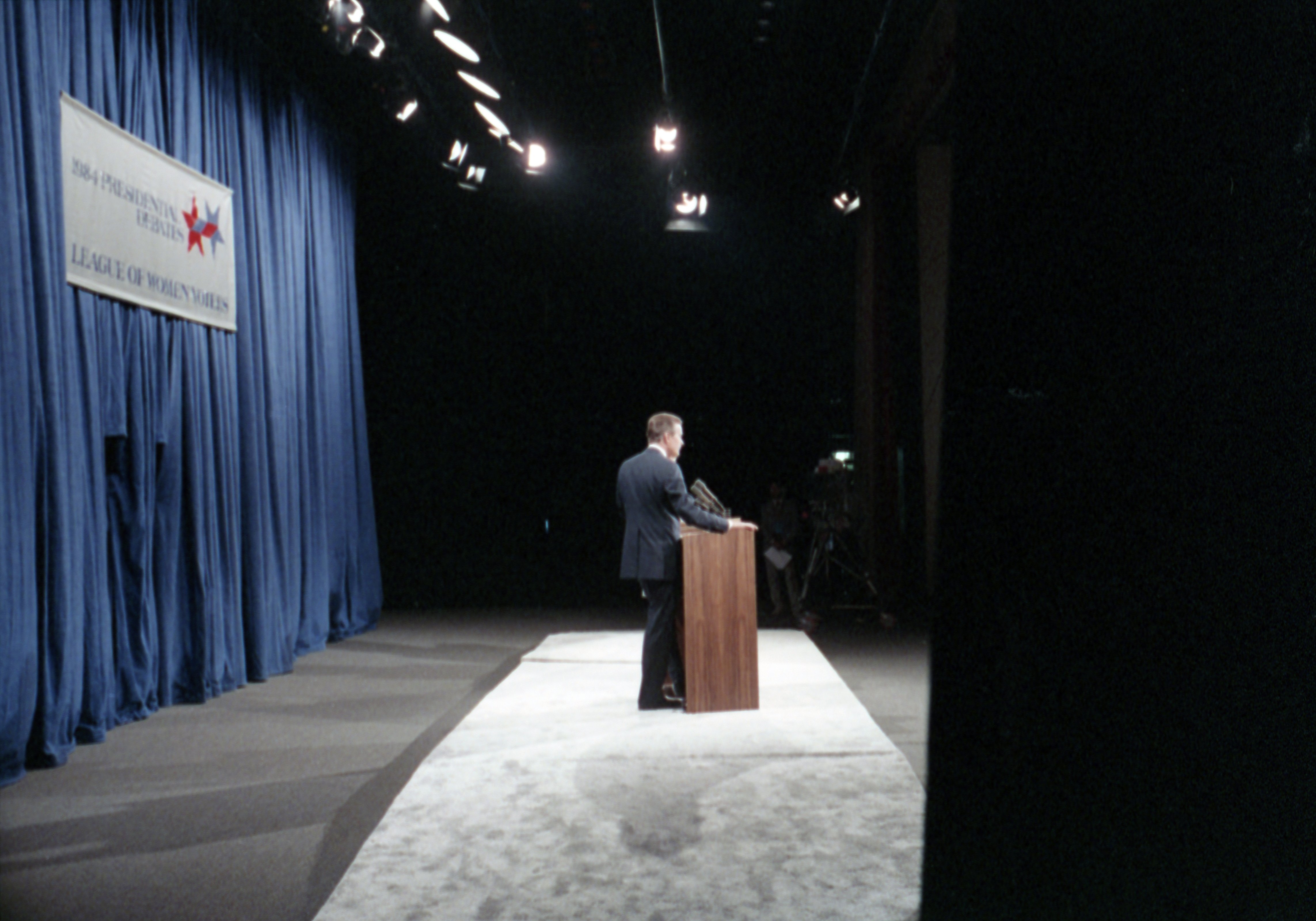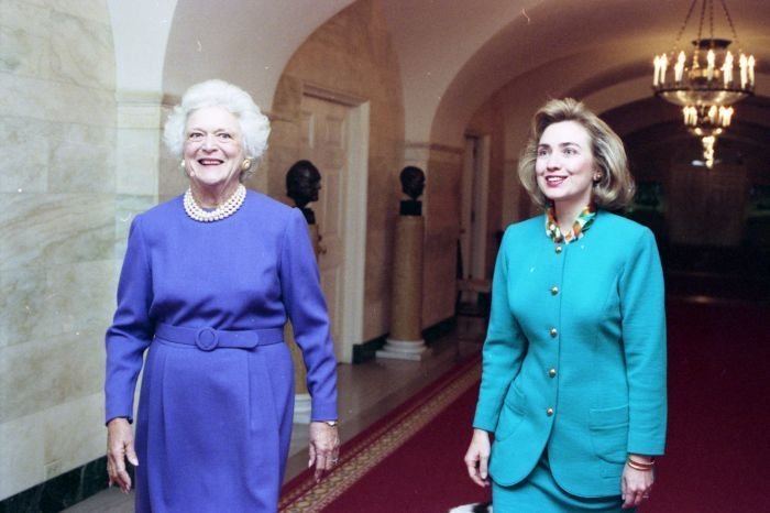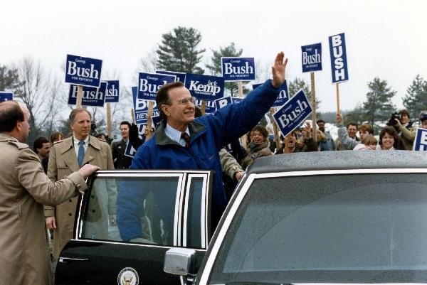 As George Bush talks on the phone, his wife, Barbara, looks over his shoulder at the George Bush for Senate Headquarters, Aleene Smith's office, in Houston, TX, 1964View in the National Archives Catalog