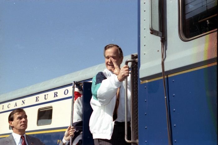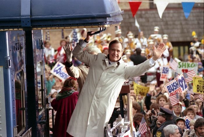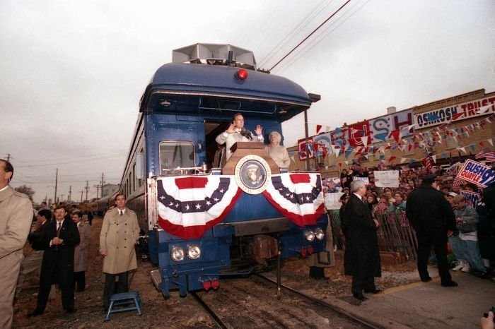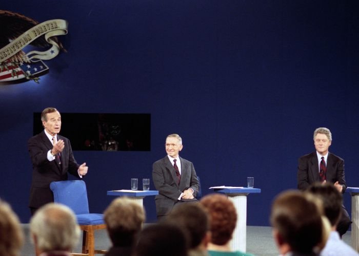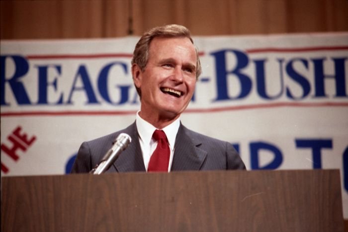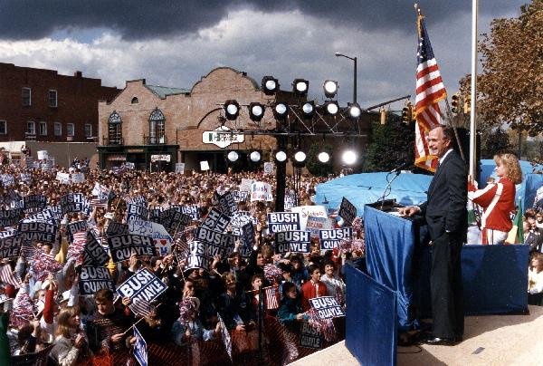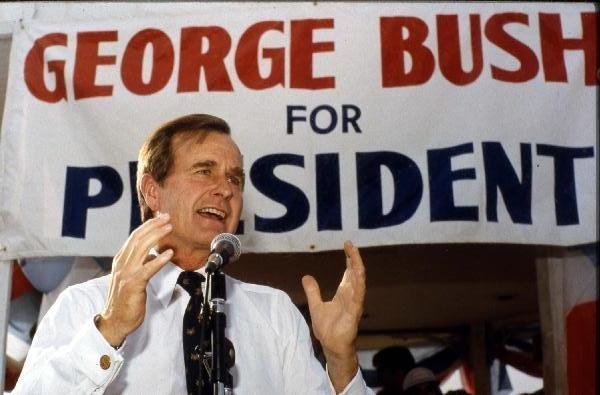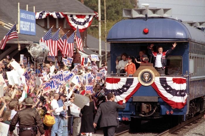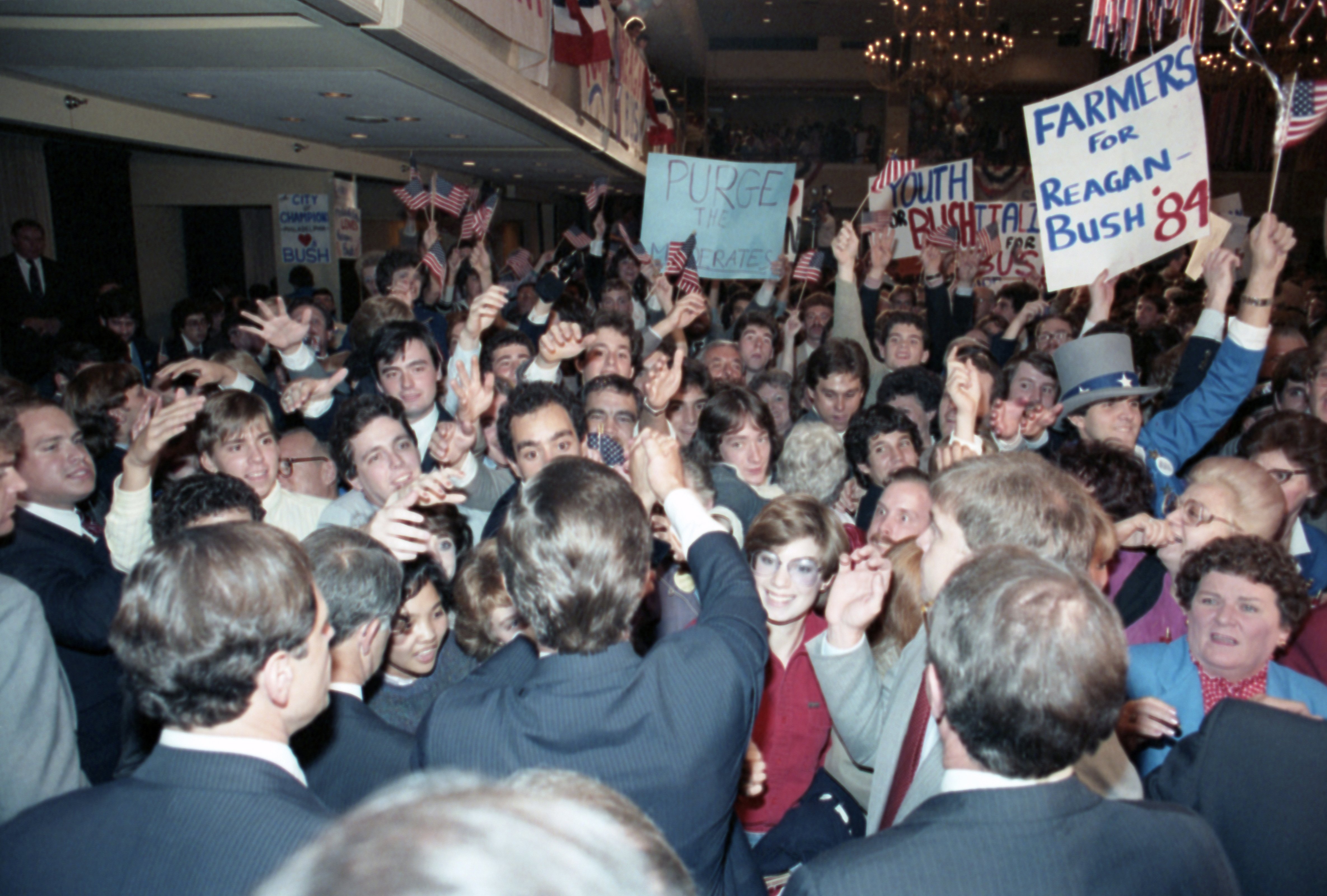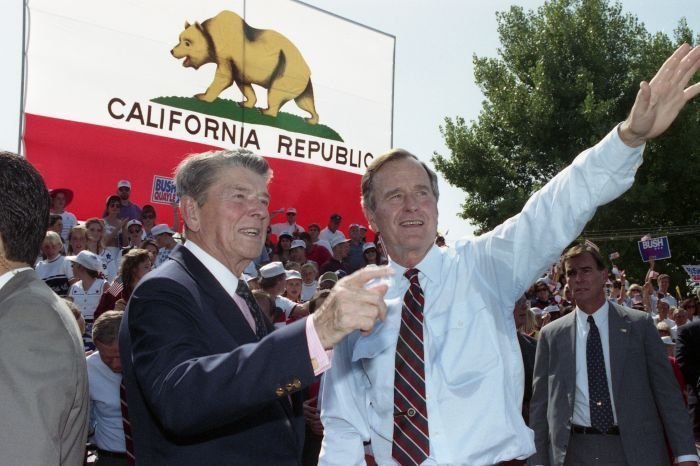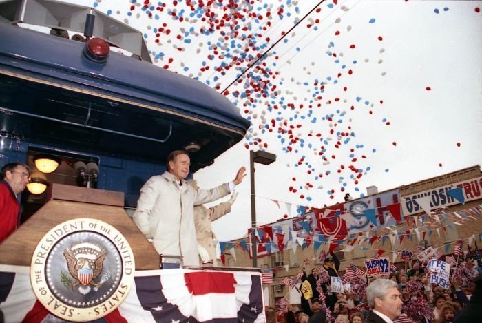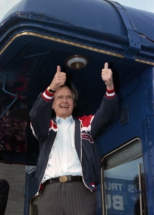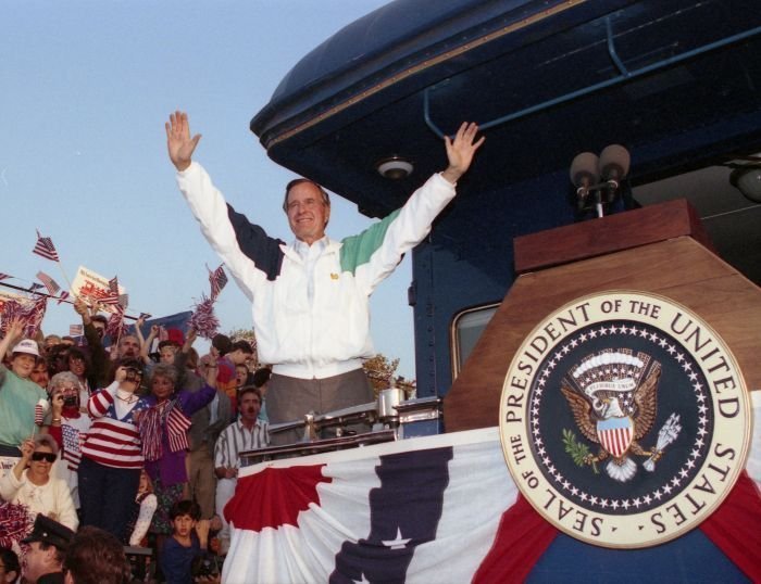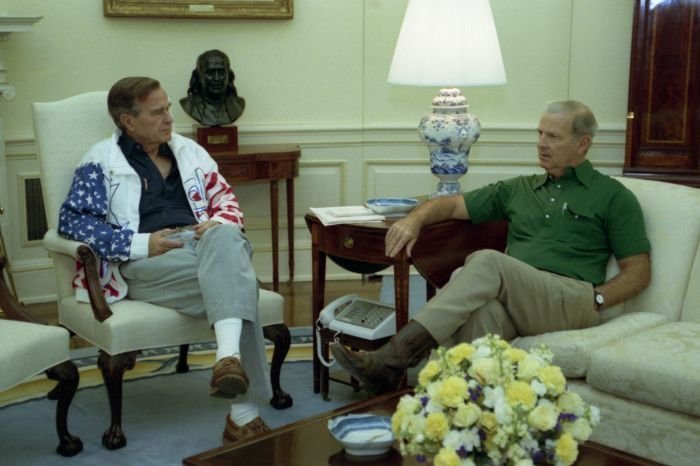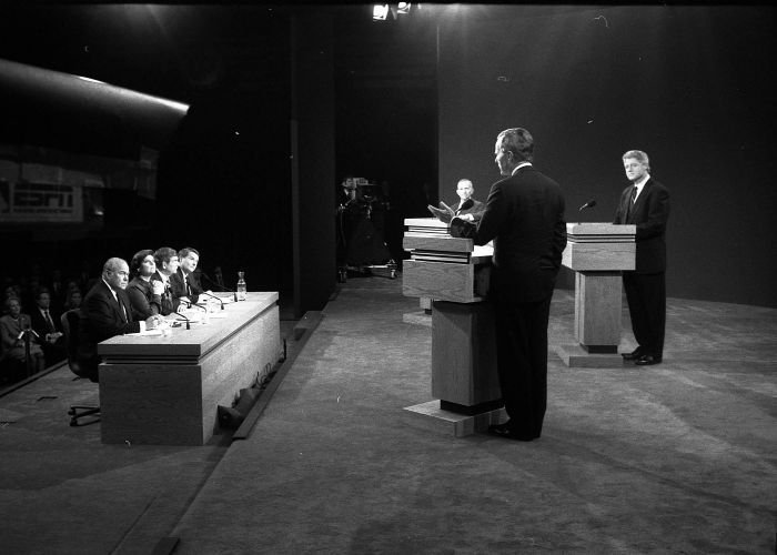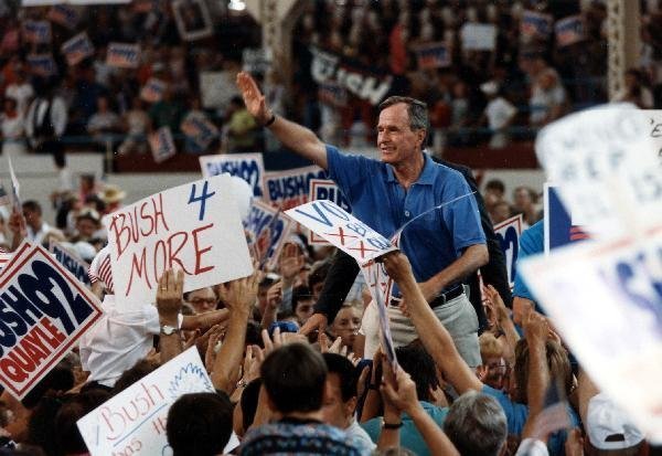 As George Bush talks on the phone, his wife, Barbara, looks over his shoulder at the George Bush for Senate Headquarters, Aleene Smith's office, in Houston, TX, 1964View in the National Archives Catalog
