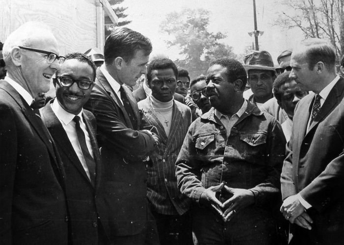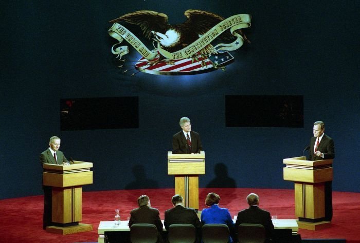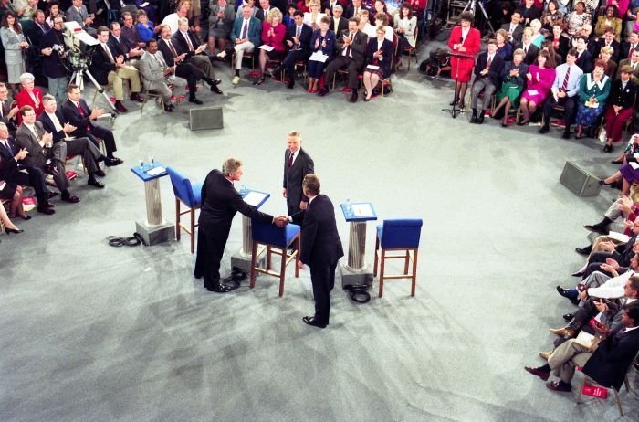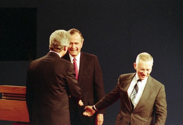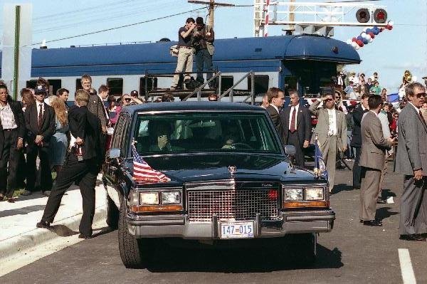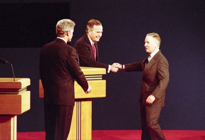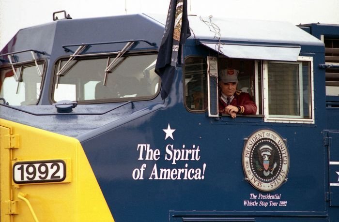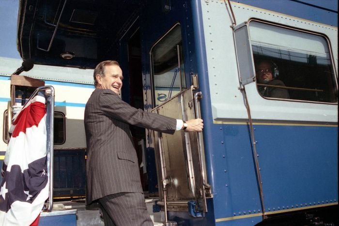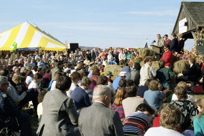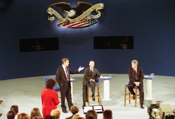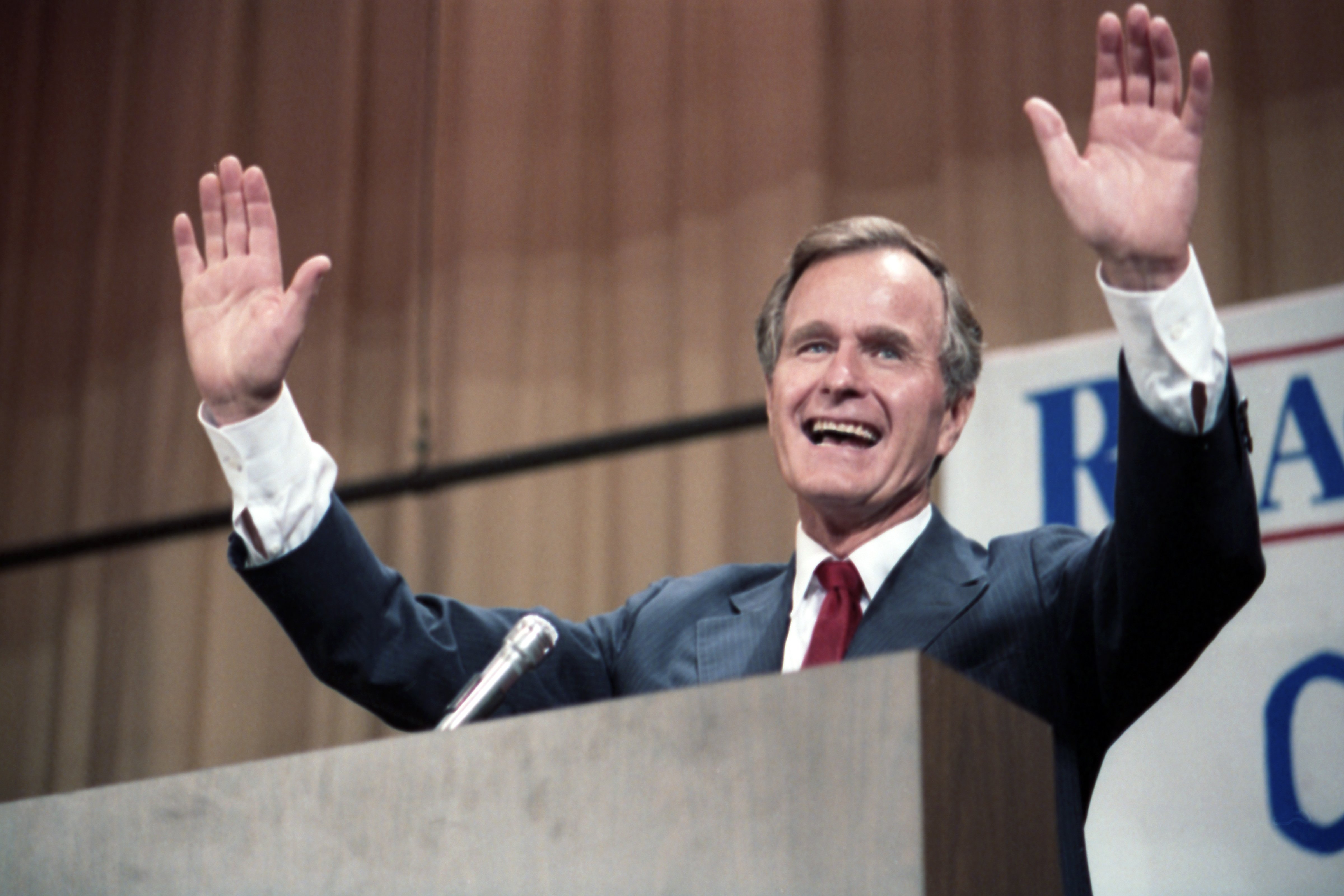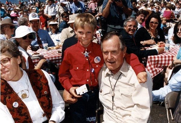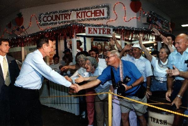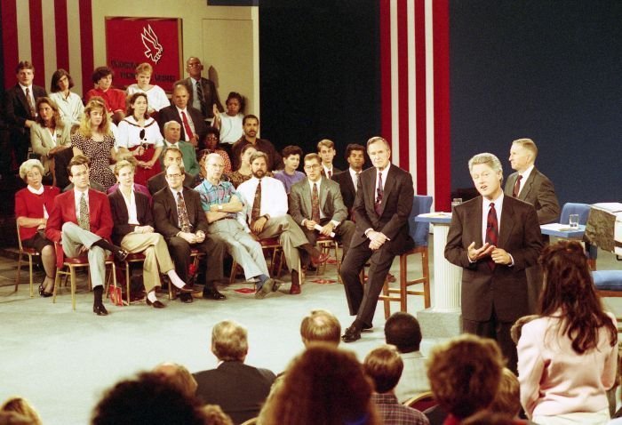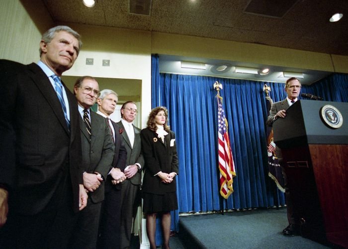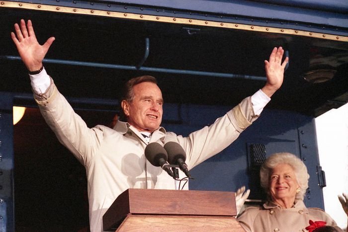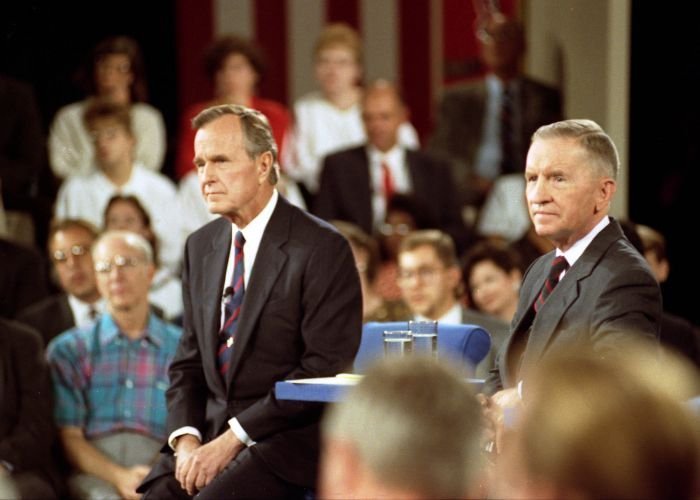 As George Bush talks on the phone, his wife, Barbara, looks over his shoulder at the George Bush for Senate Headquarters, Aleene Smith's office, in Houston, TX, 1964View in the National Archives Catalog