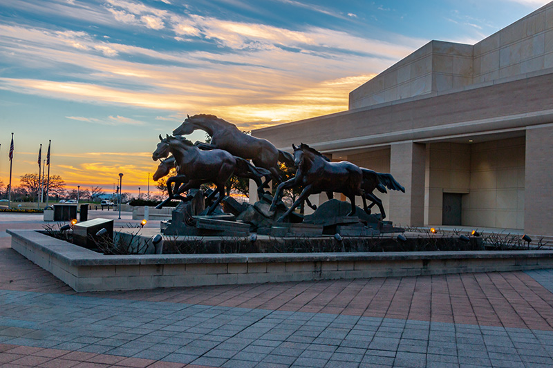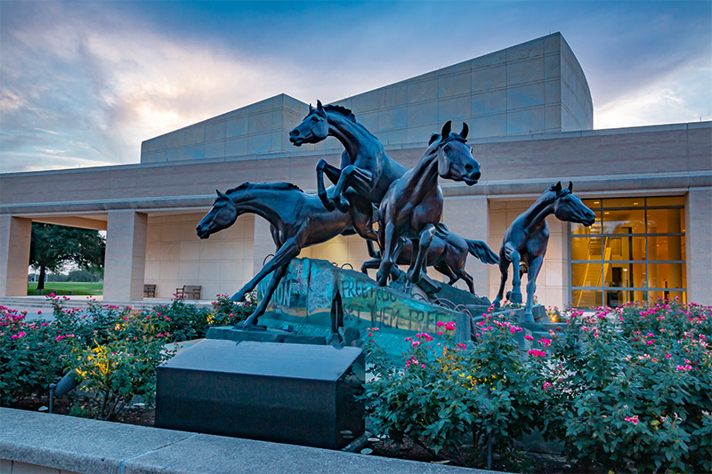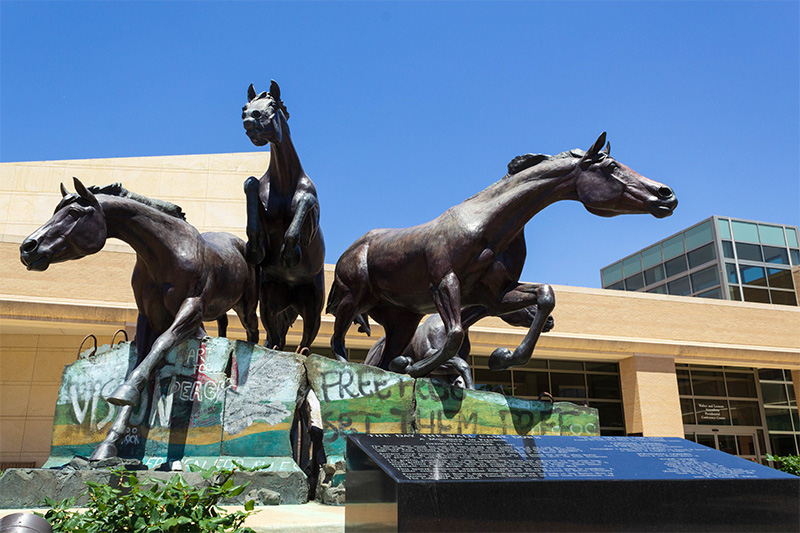 The graffiti painted on the rubble beneath the horses was replicated by the artist from actual graffiti painted on the Berlin Wall. At President Bush’s request, the names of 15 people killed at the Berlin Wall were written on the “Dove of Peace.” These names represent over 900 people who were killed trying to escape to the West. This bronze monument weighs seven tons and took the artist three and a half years to complete. A “sister” casting is on permanent display at the Allied Museum in Berlin, Germany.