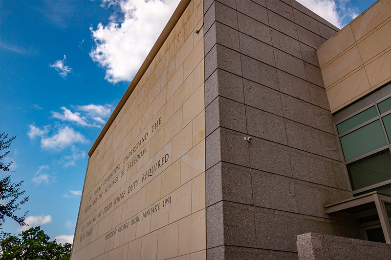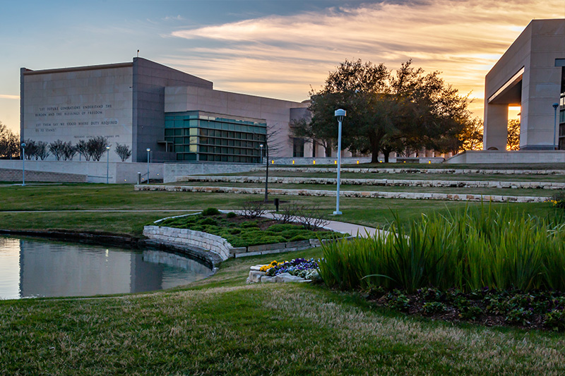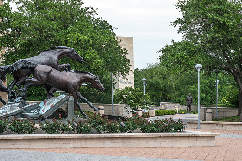 The placement of the sculpture, in the middle of the Bush Center, symbolizes the unique past, present, and future dynamic between the George Bush Presidential Library and Museum, the George Bush School of Government and Public Service, and the George and Barbara Bush Foundation. The missions of the various entities of the Bush Center represent and fulfill so many of the guiding principles that George Bush held strongly, and it is fitting that this statue stands here as a visual reminder of his legacy.